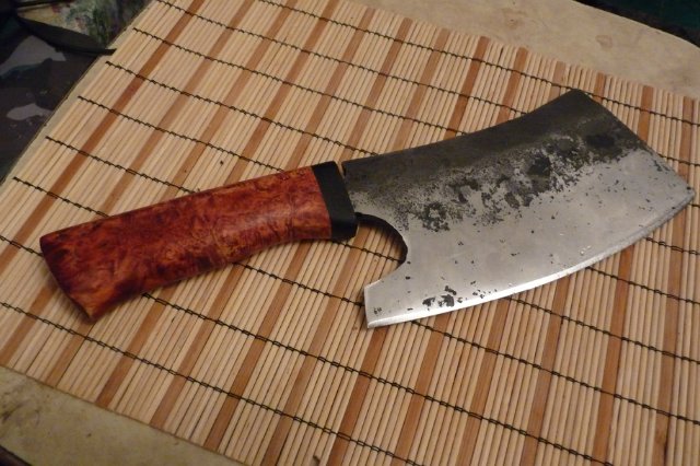 С тепловозного клапана ,ручка из изюбриного рога с художественной резьбой. Подарил своему помощнику ,пять лет в одной кабине. Пришёл в гости на их семейный праздник. Там не всё готово ,я помощь на кухне предложил. А Мариша просит нож наточить , совсем тупой стал. И мой , ручной шлифовки ..... До сих пор плачу.)))