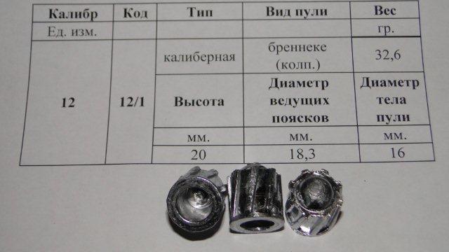 -Код 12-1: калиберная < аналог бреннеке колпачок> вес 32,6 гр. высота 20 мм. диаметр ведущих поясков 18,3 мм. диаметр тела пули 16 мм. цена: 15 руб. ;