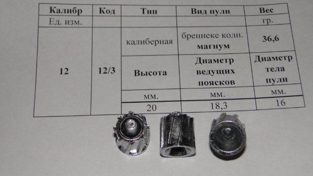 -Код 12-3: калиберная < аналог бреннеке колпачок МАГНУМ> вес 36,6 гр. высота 20 мм. диаметр ведущих поясков 18,3 мм. диаметр тела пули 16 мм. цена: 17руб. ;