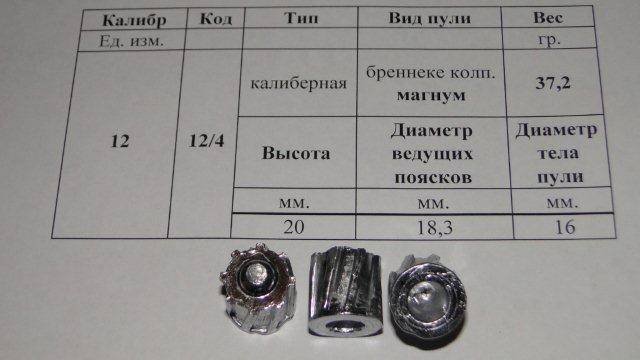 -Код 12-4: калиберная < аналог бреннеке колпачок МАГНУМ> вес 37,2 гр. высота 20 мм. диаметр ведущих поясков 18,3 мм. диаметр тела пули 16 мм. цена: 17руб. ;