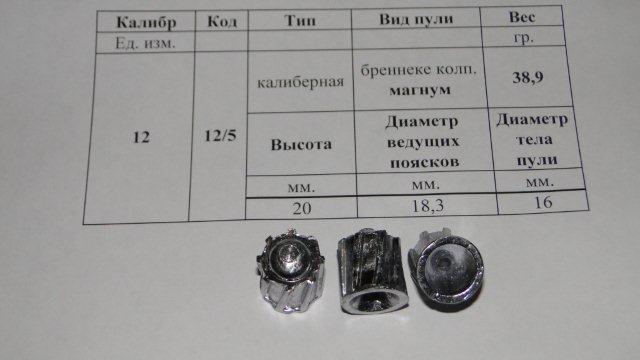 -Код 12-5: калиберная < аналог бреннеке колпачок МАГНУМ> вес 38,9 гр. высота 20 мм. диаметр ведущих поясков 18,3 мм. диаметр тела пули 16 мм. цена: 18руб. ;