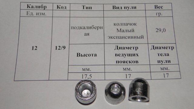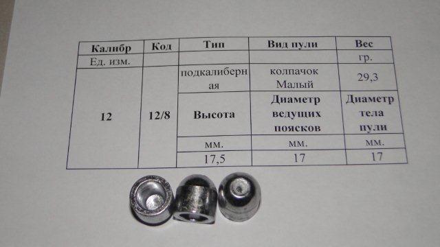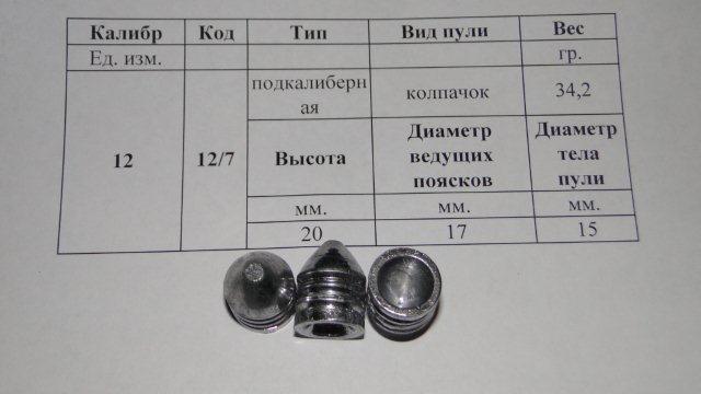 -Код 12-2: калиберная < аналог бреннеке колпачок> вес 34,9 гр. высота 20 мм. диаметр ведущих поясков 18,3 мм. диаметр тела пули 16 мм. цена: 16 руб. ;
