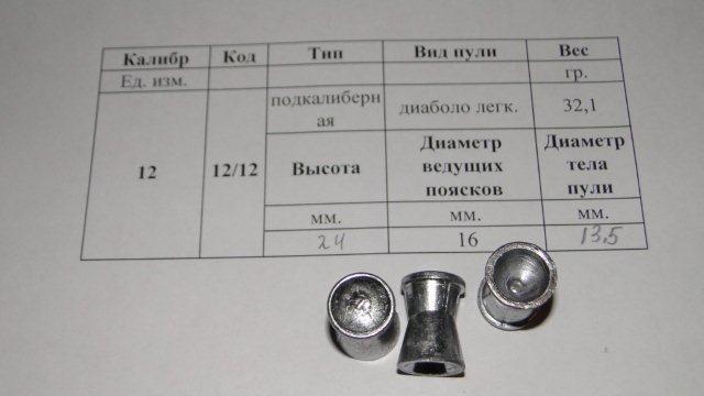 -Код 12-12: подкалиберная <диаболо легк. > вес 32,1 гр. высота мм. диаметр ведущих поясков 16 мм. диаметр тела пули мм. цена: 13 руб. ;