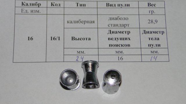 -Код 16-1: калиберная <диаболо стандарт> вес 28,9 гр. высота мм. диаметр ведущих поясков 16 мм. диаметртела пули мм. цена: 12 руб. ;