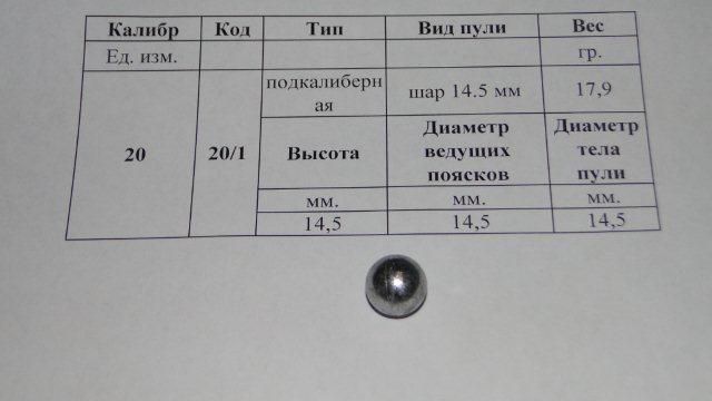 - Код 20-1: подкалиберная <шар> диаметр 14,5 мм. вес 17,9 гр. цена: 9 руб. ;