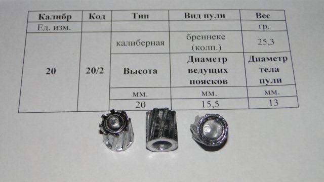 -Код 20-2: калиберная < аналог бреннеке колпачок> вес 25,3 гр. высота 20 мм. диаметр ведущих поясков 15,5 мм. диаметр тела пули 13 мм. цена: 12 руб. ;