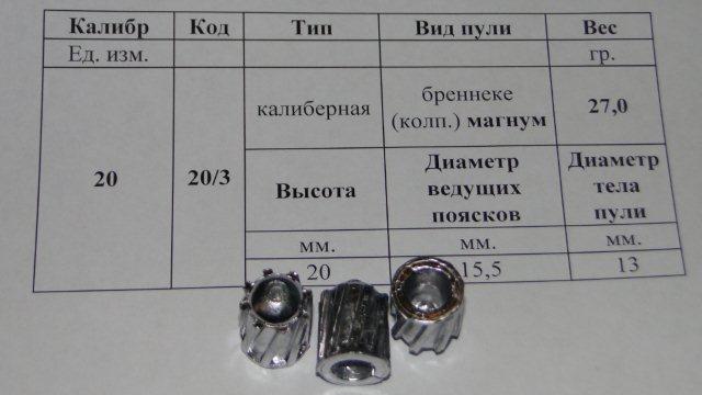 -Код 20-3: калиберная < аналог бреннеке колпачок МАГНУМ> вес 27,0 гр. высота 20 мм. диаметр ведущих поясков 15,5 мм. диаметр тела пули 13 мм. цена: 14руб. ;