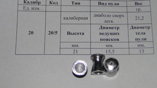 -Код 20-5: калиберная <диаболо сверх легк. > вес 21,2 гр. высота 21 мм. диаметр ведущих поясков 15,5 мм. диаметр тела пули 13 мм. цена: 10 руб. ;