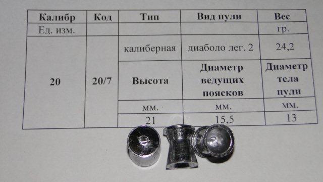 -Код 20-7: калиберная <диаболо легк. 2> вес 24,2 гр. высота 21 мм. диаметр ведущих поясков 15,5 мм. диаметр тела пули 13 мм. цена: 10 руб. ;