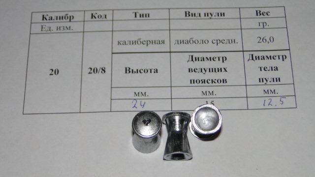 -Код 20-8: калиберная <диаболо средн. > вес 26,0 гр. высота мм. диаметр ведущих поясков 15 мм. диаметр тела пули мм. цена: 10 руб.