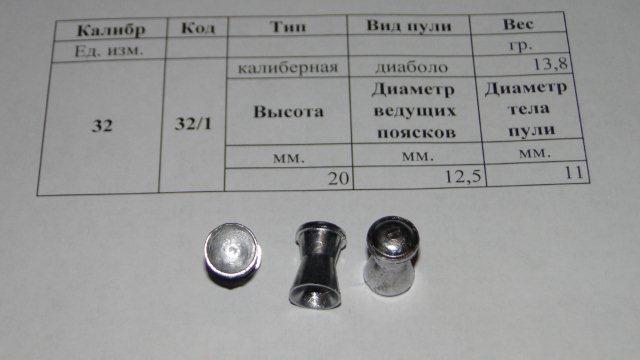 Код 32-1: <диаболо> вес 13,8 гр. высота 20 мм. диаметр ведущих поясков 12,5 мм. диаметр тела пули 11 мм. цена: 9 руб.