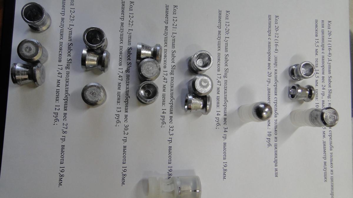 - Код 12-20: Lyman Sabot Slug подкалиберная вес 34 гр. высота 19,8мм. диаметр ведущих поясков 17,47 мм цена: 14 руб.;