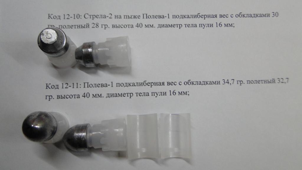 Код 12 - 10 Стрела - 2 на пыже Полева - 1 подкалиберная вес с обкладками 30 гр. полетный 28 гр высота 40 мм диаметр тела пули 16 мм цена 25 руб.