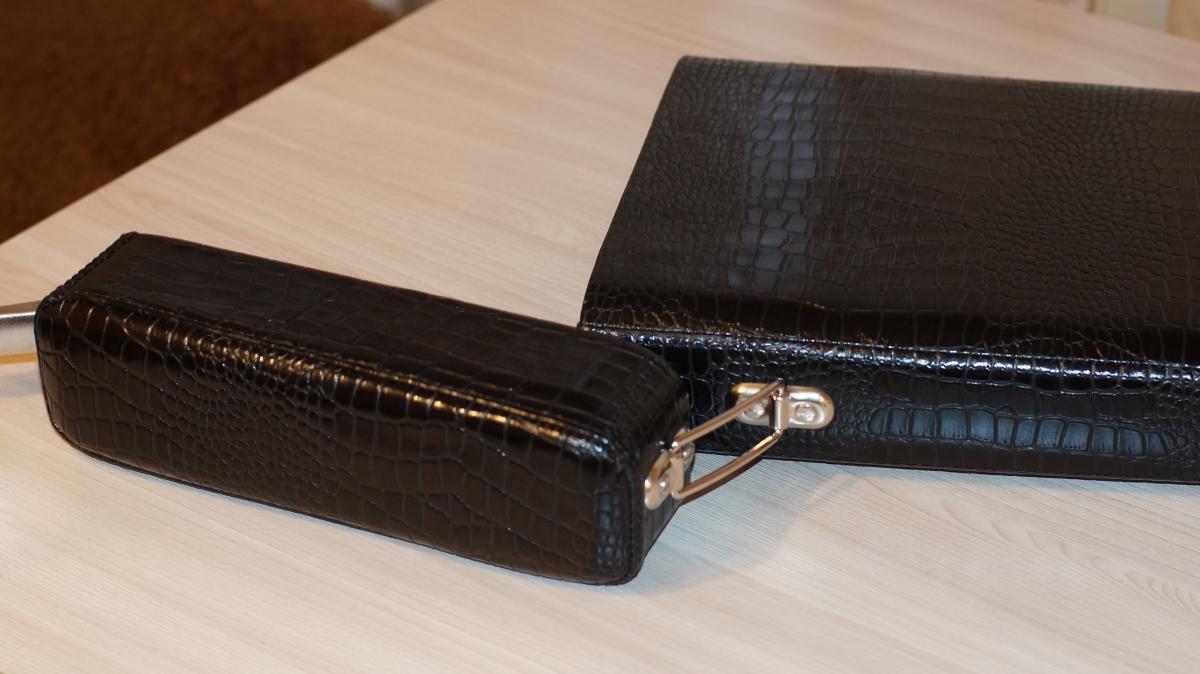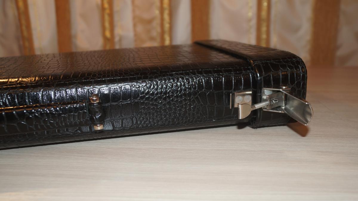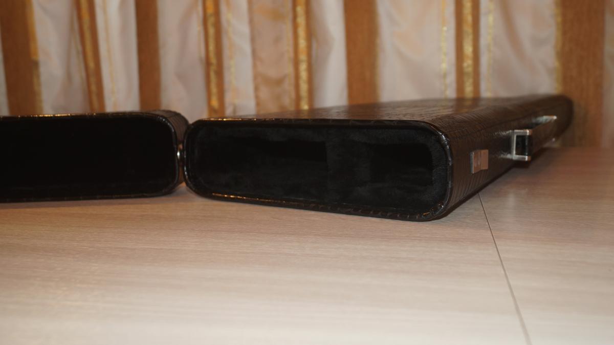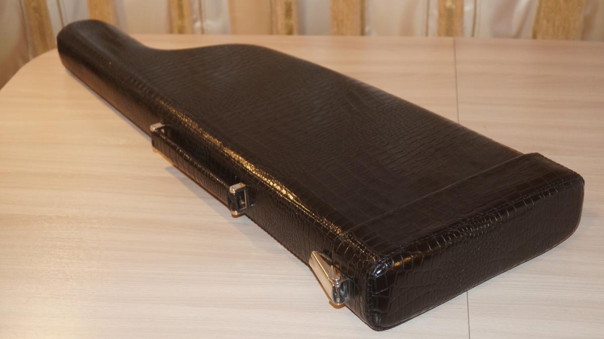 Основа кофра прочный стеклопластиковый корпус. Сверху кожа коровы, с тиснением под крокодила. Внутри оклеен овчиной. Фурнитура Итальянского производства, покрыта никелем. Регулируемая защелка из нержавеющей стали, сделана в Германии.