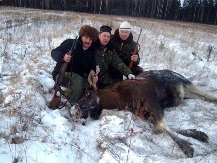 Подходит тягач, добычу (быка сбросившего рога)троссом перетаскивают ближе к лесу, егеря его ошкуривают и разделывают. Костёр, похлёбка из печени и сердца, песни, чарка, мясо отправляется на охотничью базу.