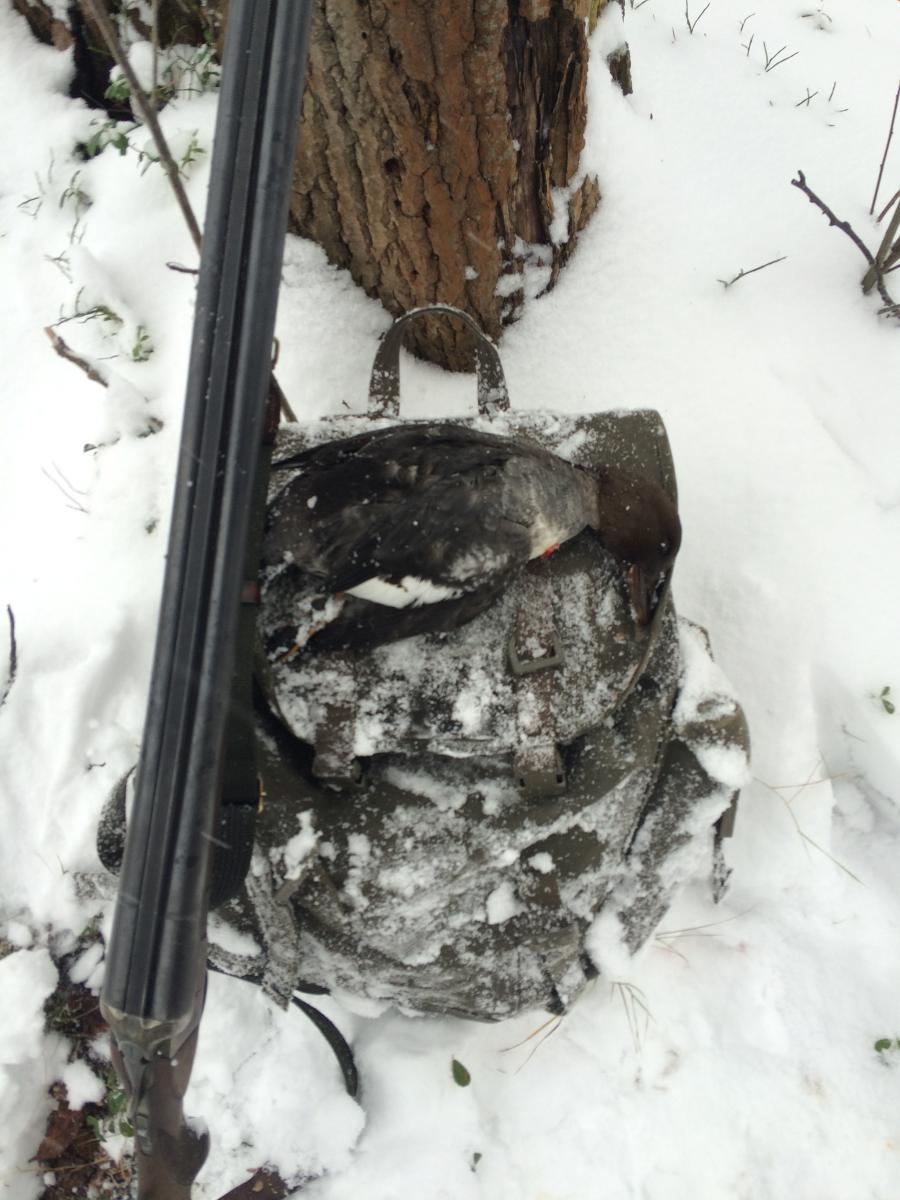 Подхожу к озеру, брякая капканами в рюкзаке – а там натуральный птичий базар. Две огромные стаи кряквы периодически облетают озеро, создавая шум взлетающего самолета. Пошел тихонько вдоль берега – по краям заберегов (5-6 метров от берега) кормятся нырковые. Как же я пожалел тогда, что нет у меня собаки. И утки много на выстреле, а достать никак. Одна, правда, уж совсем неприлично близко к берегу кормилась – за что и поплатилась. Надо доставать – срубил жердину, зашел по голенище сапог и все равно не достать. Плюнул на недолеченный бронхит, разделся и сплавал через снежную кашу – ох и бодрит вода.