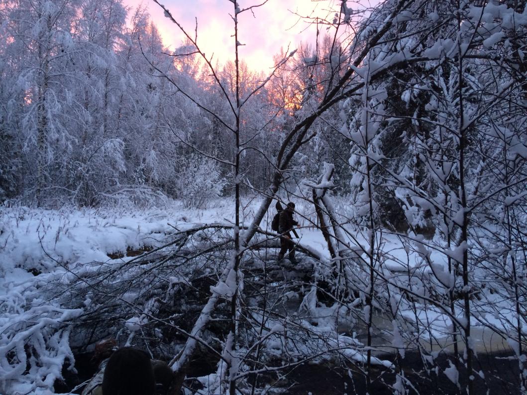 Никаких охот по водоплавающей к концу осени я уже не планировал. Мне как раз пришла посылка с кировским железом (КП-250), свежие выходы бобра были разведаны заранее. Капканы промыты от заводской смазки, сложены в рюкзак – ждем выходного дня. И тут внезапно наваливает снега, да так, что есть опасения до озера без лыж не дойти. Ну, делать нечего, идти надо. Добрел до озера со всем барахлом за спиной, а озеро все в шуге и подмерзает. По берегам снега навалило 20-30 см. Какие уж тут капканы. Может для опытных капканщиков это и не проблема, но мне до этого звания еще далеко. Посидел, повздыхал на берегу. Слышу свист крыльев – утка плюхается в шугу по центру озера. Ну что ее стрелять? Достать никак. Встал - утка дала по тапкам. Ну, думаю, делать нечего – схожу на большое озеро, где охоту открывал – может там не все еще шугой занесло.