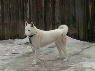 Чисто белая собака. Находится в Подпорожье, содержится за городом.