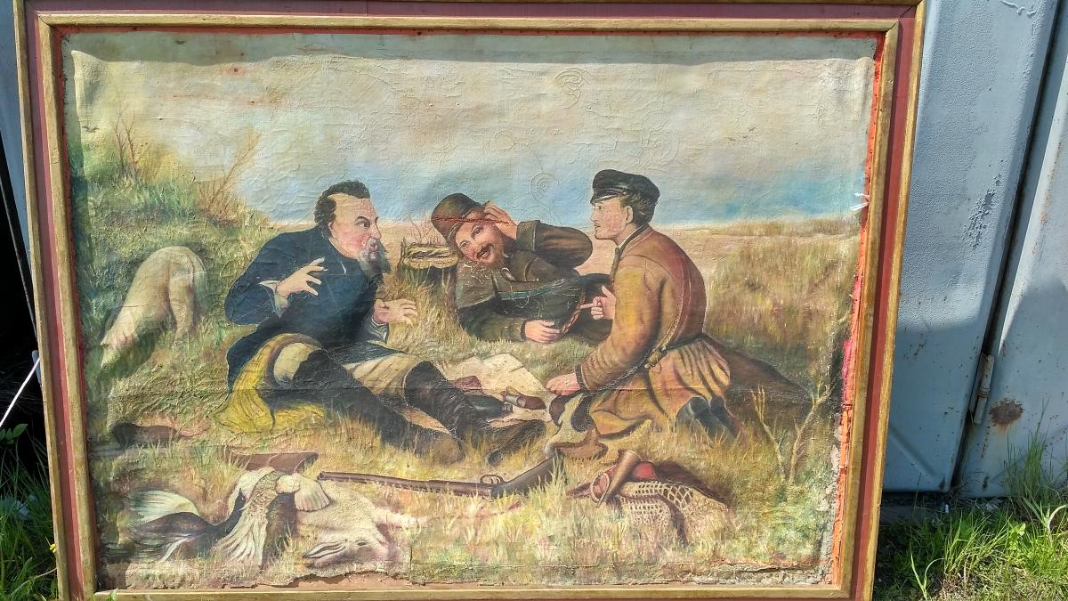 26. Картина "Охотники на привале" масло холст размер прим.120*160. Требует реставрации все на фото. Цена 2200р. Новая цена на "исскуство" 2000р.