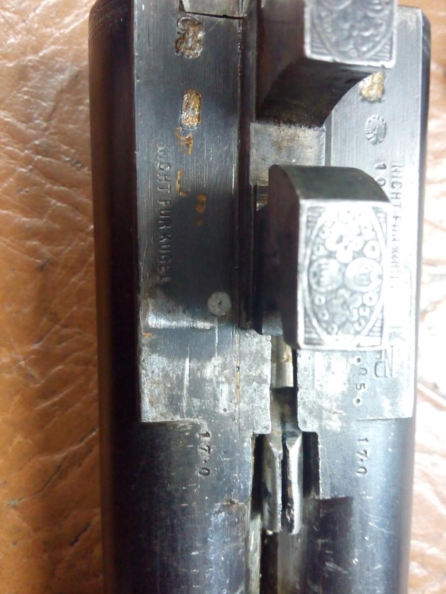И так, на данный момент исходя из сообщений на "Ганзе" мне известно следующее: 1. Имеется испытательное клеймо (австро-венгрии) 2. "Nicht für Kugel" - "Не для пуль". Наличие этой надписи говорит о наличии чокового сужения? Причем на сколько я понял очень большого см. фото (17.0 на обоих стволах). 3. Имеется клеймо об испытании стволов бездымным порохом. 4. Имеется номер протокола отстрела готового ружья и год отстрела. (В данном случае 26.05 означает: протокол отстрела готового ружья № 26, год отстрела - 1905). Оно эжекторное, что является редкостью для тех годов и скорее всего исполнялось на заказ.