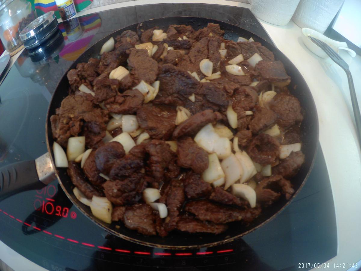 Разогреваю сковороду и масло, обжариваю мясо на сильном огне, периодически сливаю избыток жидкости. Обжариваю до образования хорошей корочки, затем добавляю чуть горячей воды и пропариваю мясо в течении 40-60 минут, периодически помешивая и добавляя воду.