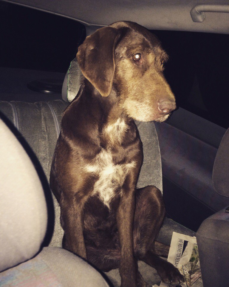 Найдена возле Кировска собака среднего возраста, легаш, шоколадная с маленьким белым пятнышком на груди.Бежала по трассе. Явно знает машину. Без ошейника, скорее всего с охоты, из леса.