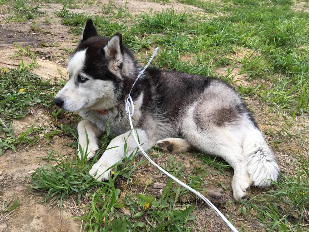 Пришёл хаски, с рыжим пластиковым ошейником, серый с белым, сухой корм не ест.