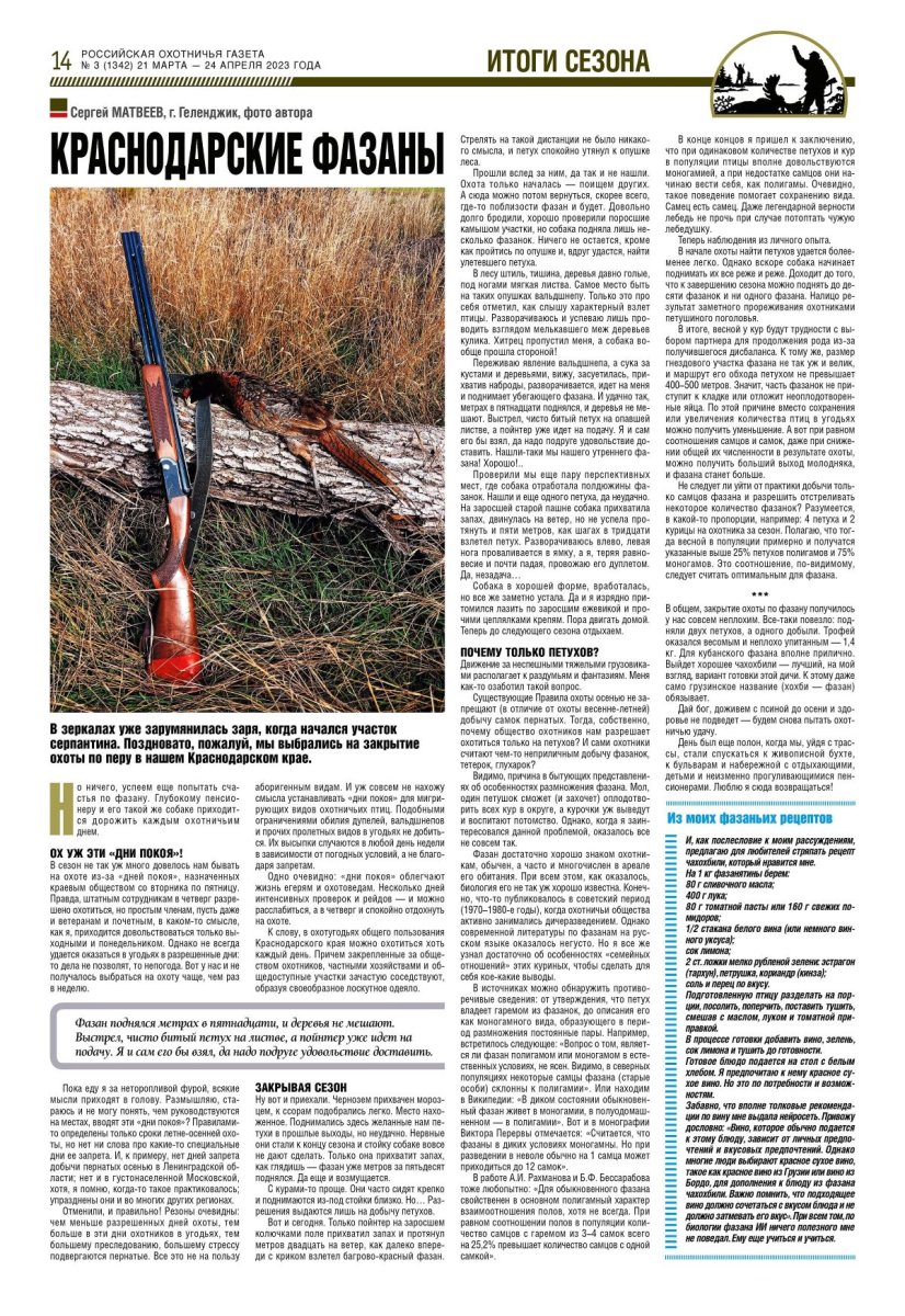 В «Российской охотничьей газете» № 3 (21 марта — 24 апреля) 2023 года напечатана статья Сергея Матвеева «Краснодарские фазаны». В ней рассказывается об охоте на кубанского фазана в сезоне охоты 2022 года и некоторых проблемах, связанных с её организацией.