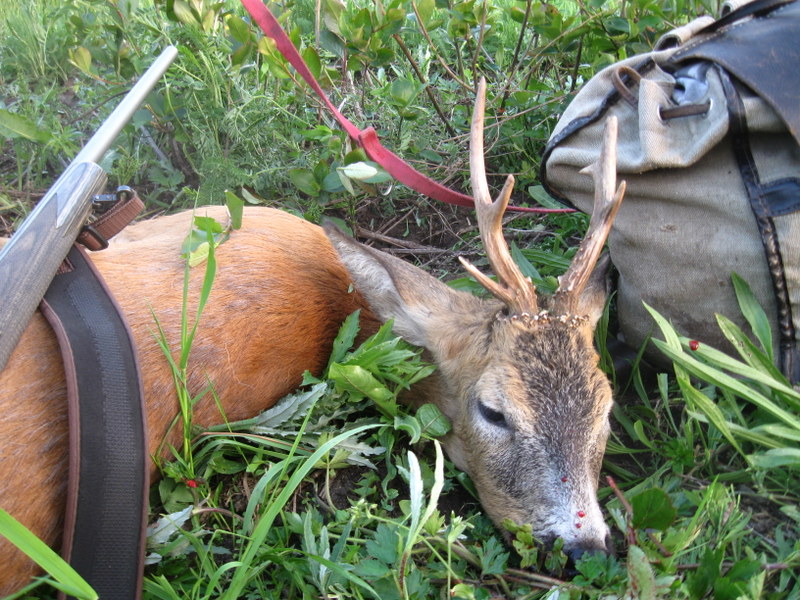 В этот вечер посиделки были не долгими, утром снова выход на охоту. Несколько часов сна, быстрые сборы и мы снова в полях. По пути к месту охоты прямо за поселком около зарослей кустарника стояли 6 красавцев быков оленя. От приближения машины они ушли в заросли боярышника. Какие красавцы!!! Двигаем дальше. Только закрыли машину, замечаем мелькнувшего в обочину зозлика. Подходим к месту перехода. Наш старый знакомый козелок с рожками серны так же безнаказанно уходит от нас пшеницей, не показывая тело для выстрела.Идем дальше. Справа остался сенокос. Подходим к переезду через канаву и замечаем очередного рогачика. Быстро и бесшумно огибаем поворот дорожки, я готовлюсь к выстрелу. Козлик выходит из-за куста и движется травой в посадку молодых сосен.Я целюсь, Марчин быстро и профессионально оценивает козла как селективного, можно стрелять. Выстрел, шлепок попадания и козел в смертельной агонии тяжелыми прыжками скрывается в траве. Подходим к месту стрела. Быстро находим обильную кровь а затем и наш трофей. На часах четыре утра а мы уже с добычей! Традиционный незыблимый охотничий ритуал и легкая фотосессия.