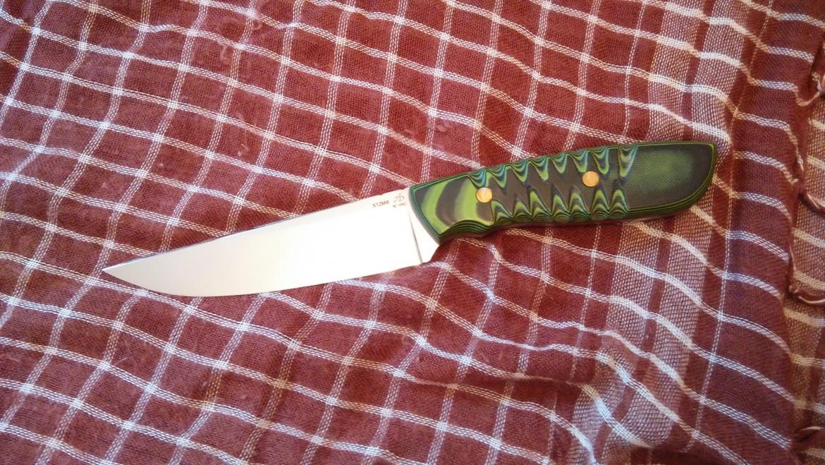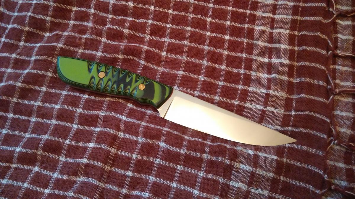 Клинок: А.Бирюков, Х12МФ, 60hrc, Рукоять: G10, фибра. Накладной монтаж на эпоксидную смолу и винты.