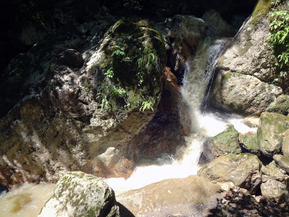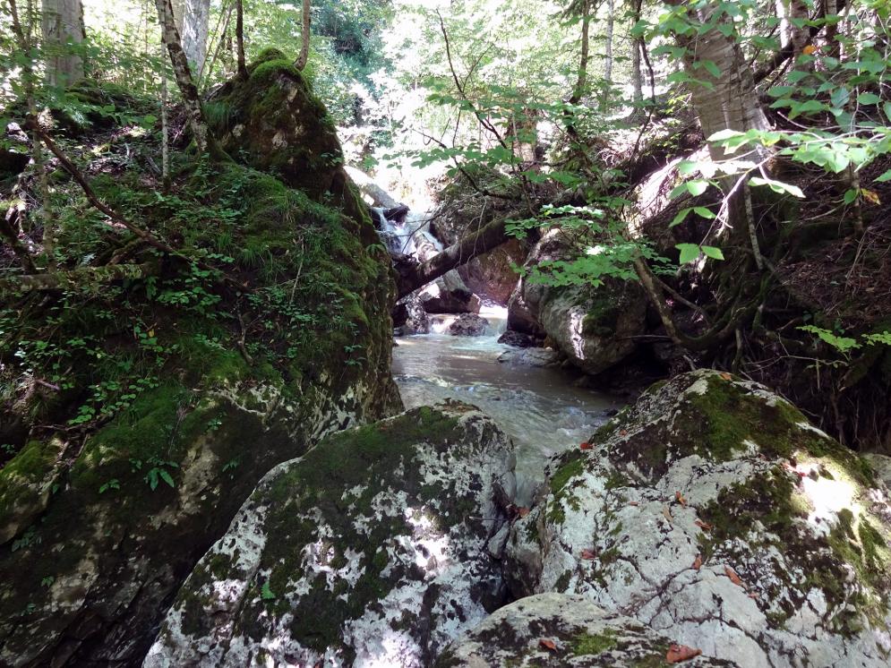 Чтобы попасть к Расколу, необходимо перейти Бзыху. Однако противоположный берег крутой, с осыпями, заросшими ежевикой и крапивой. Подыматься по такому склону проблематично. На карте имеется обозначенная тропа, но в реальности найти ее не удалось. Время уже поджимает, до обратного автобуса остается 2 часа. Останавливаемся на обед и начинаем движение обратно в сторону поселка по туристической тропе. Тропа местами теряется, местами разбита лесовозами, видны следы рубок.
