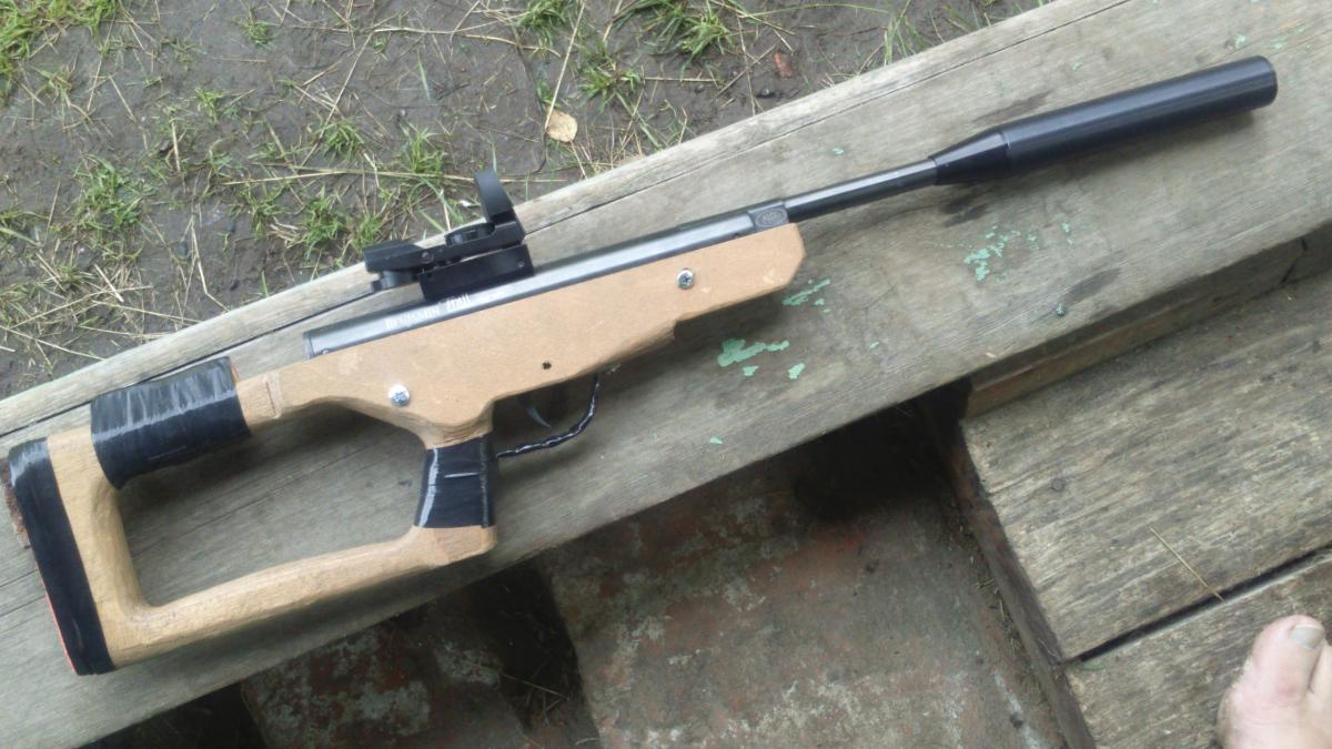 Основу купил тут, давно уже - Crossman Benjamin nitro pistol. Ручку снял, выпилил из фанеры приклад. Подогнал размеры к мелкому тельцу :)