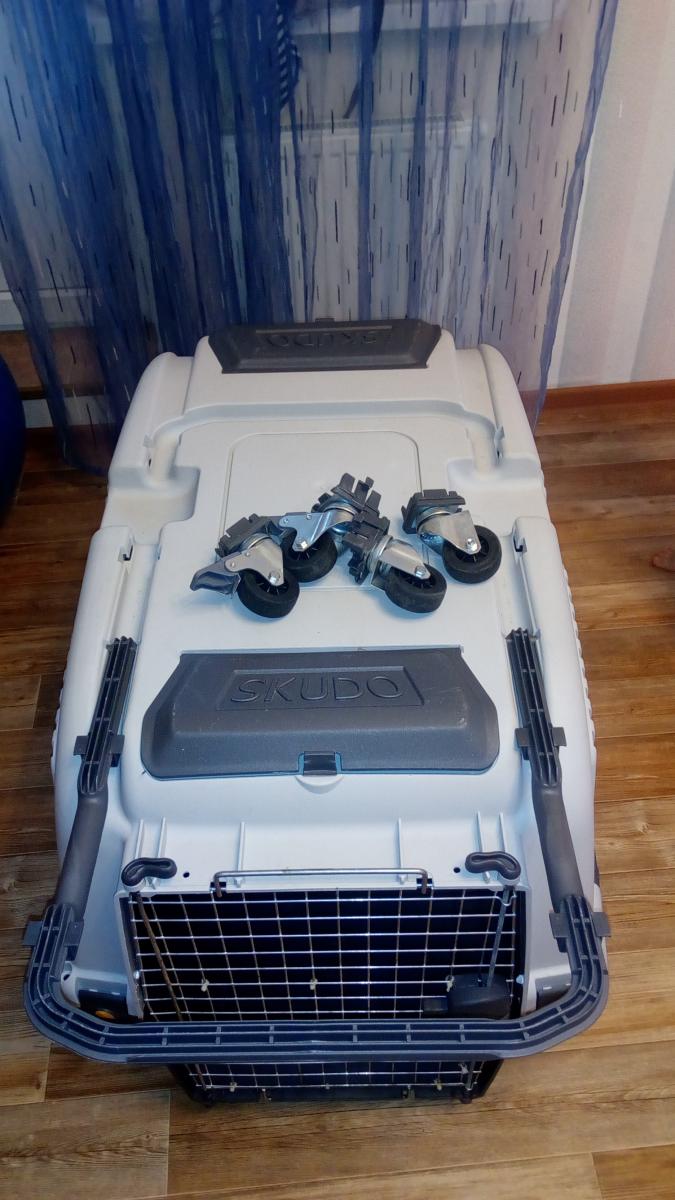 Авиабокс продан. Всем спасибо. Продам авиабокс, состояние нового, всего один раз летал взрослый кобель Веймаранера. Размеры бокса: 92 x 63 x 70 cm, вес 8.2кг. В комплект входят два поворотных передних колеса и два задних колеса. Вес четырех колес - 1,1 кг.