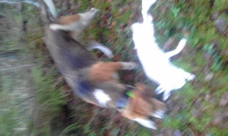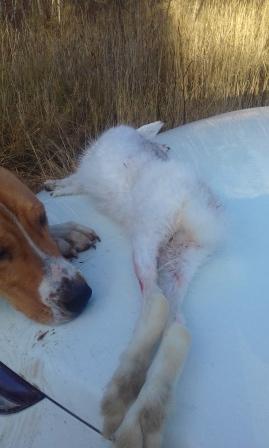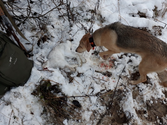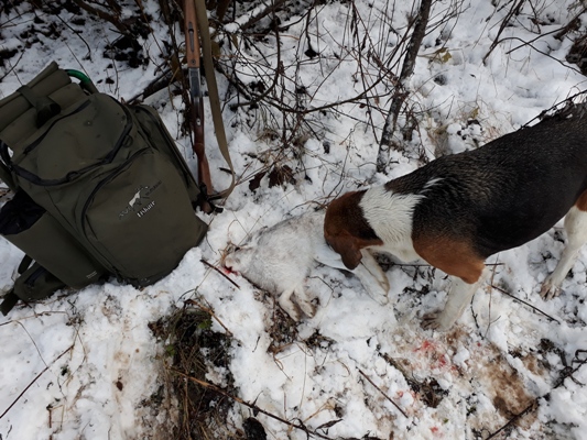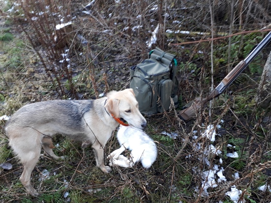 Вчерашний выход в угодья. Гоняли двух зайцев, одного добыл.