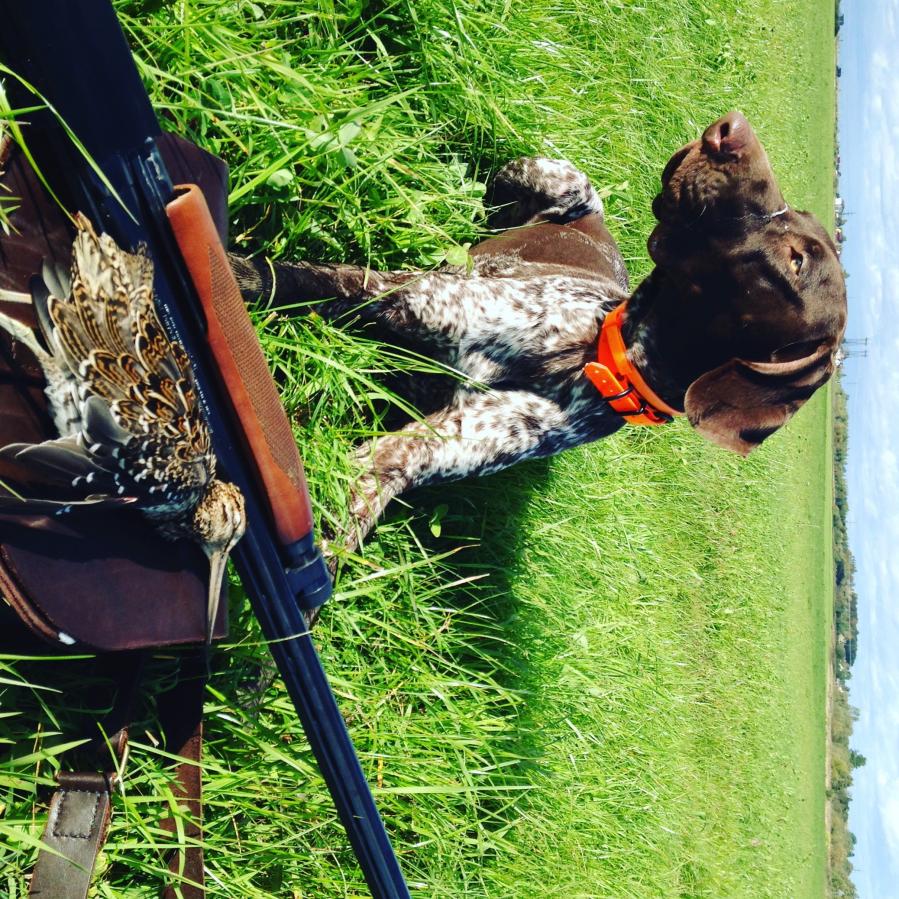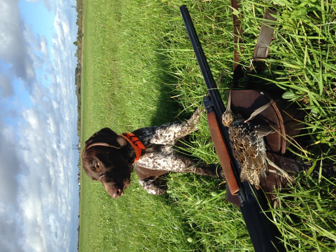 Боязнь выстрела получилось преодолеть за 11 выездов. Начинал с хлопка в ладоши (это было самое сложное). Собака вздрагивала, поджимала хвост. Приходилось делать перерывы. Далее выстрелы капсюлями - сразу все было нормально. Потом - патроны хилти. Все хлопки и выстрелы после стойки. И вот на 11 ом выезде выстрел из ружья. Первы раз дал маху, но Август не шелохнулся. Второй - попал! Птица упала. Август стоит. Я на эмоциях кричу - молодец!!! красавчик!!! давай найдем твоего бекаса! Август спокойно пошел к месту падения. Птица оказалась подранком. Август спокойно взял и отдал мне (думаю, он был под впечатлением как и я))) Я убрал птицу в сумку и тут началось))) Гавканье, прыганье, виляние хвостом и тд!!! Для фото удалось успокоить. На этом тренировку закончили.