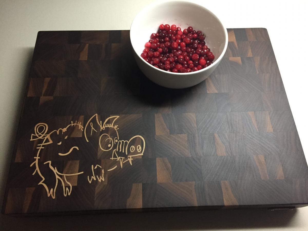 Полстакана мороженой брусники. Торцевая разделочная доска из ореха с фирменным знаком - моя прелесть!