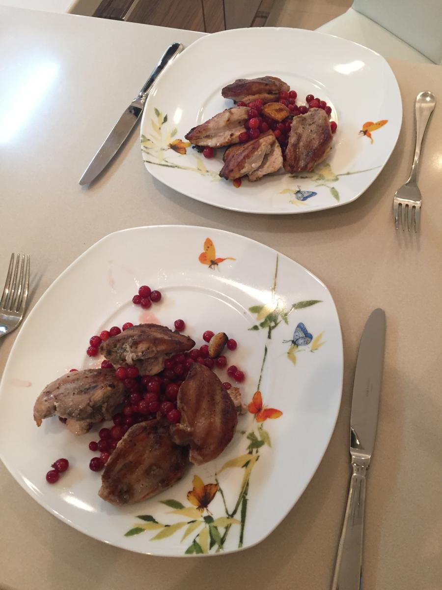 иииии тут же, не давай им опомниться и истечь соками, снимаю грудки и кладу на приготовленную заранее фольгу с подушкой из брусники: