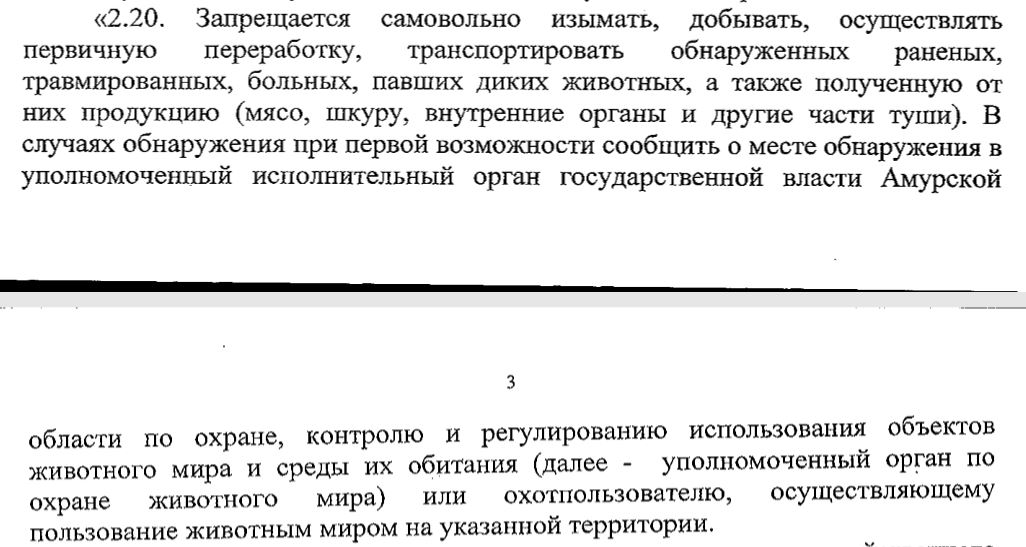 Найденных раненых или павших животных, а также их части и продукцию (шкуру, мясо, органы) запрещено самовольно изымать и перевозить. Охотник, обнаруживший мертвого зверя, теперь обязан при первой же возможности сообщить о нем охотпользователю или в управление животного мира области. Также охотников будут наказывать за вырытые на полях траншеи, ямы и окопы.
