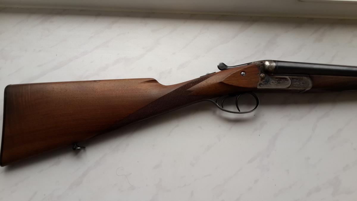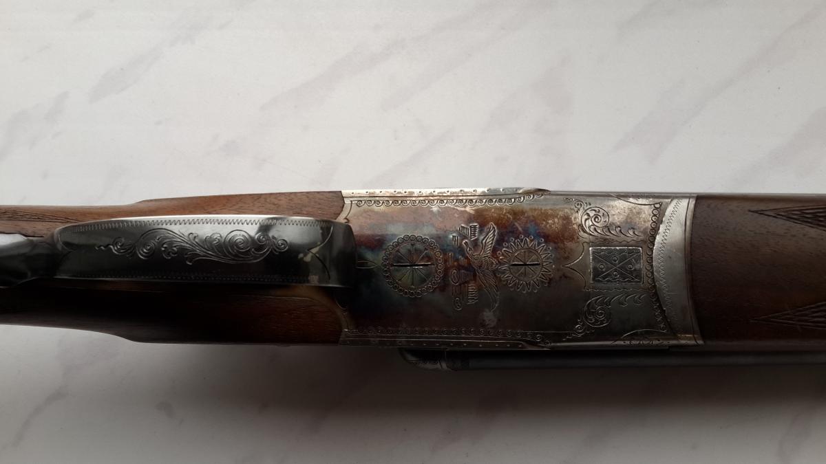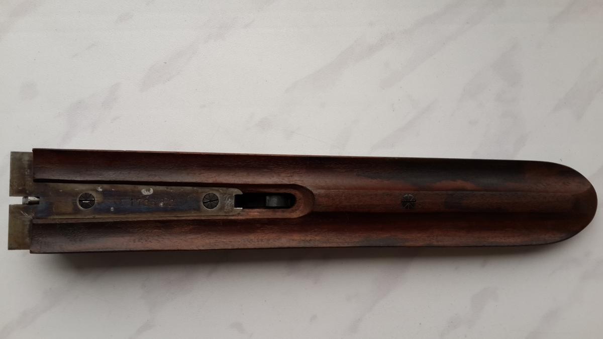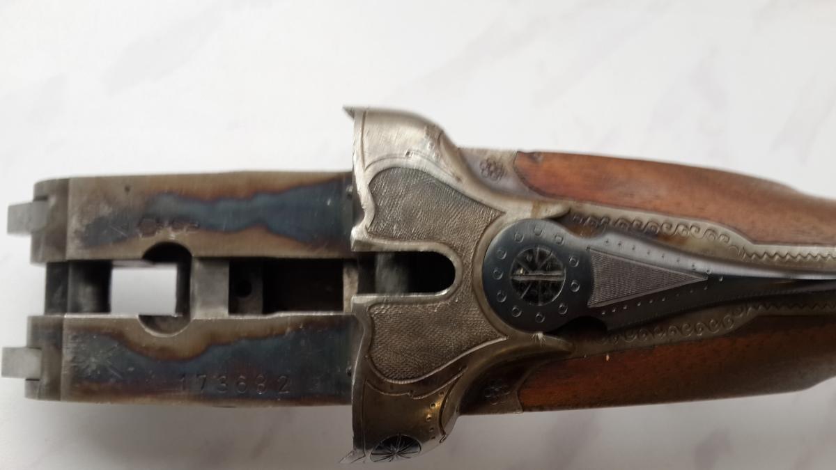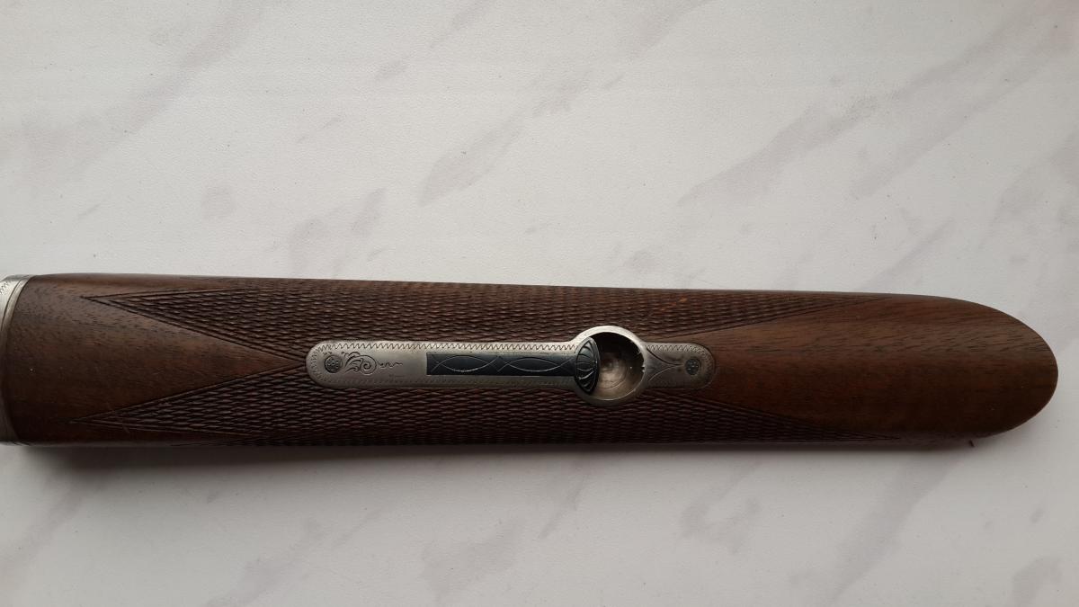 Скорее всего дерево меняно, оно слишком свежее для года и степени вытертости цветной калки на рабочих местах. Винты в цевье кручены, вообще все кручены, причём подручными средствами. Приклад плохо осадили, были щели - поставили стяжку, чтобы не переделывать. Стволы переворонены, коцки есть, но сверху всё черным-черно. Коцки на стволах, затёртая калка говорит о том, что ружьё работало, на дереве же их нет. Погиб гребня за шейкой не зимсоновский, как и сведение рельефа дерева шейки за стяжкой, насечка свежая, не затёртая, что никак не соответствует степени затёртости калки. Либо просто сняли дерево, шлифанули, обновили насечку и собрали. В общем "губы накрасили" и закинули в высший разбор! Весь пассаж- скромное мнение, без обид.