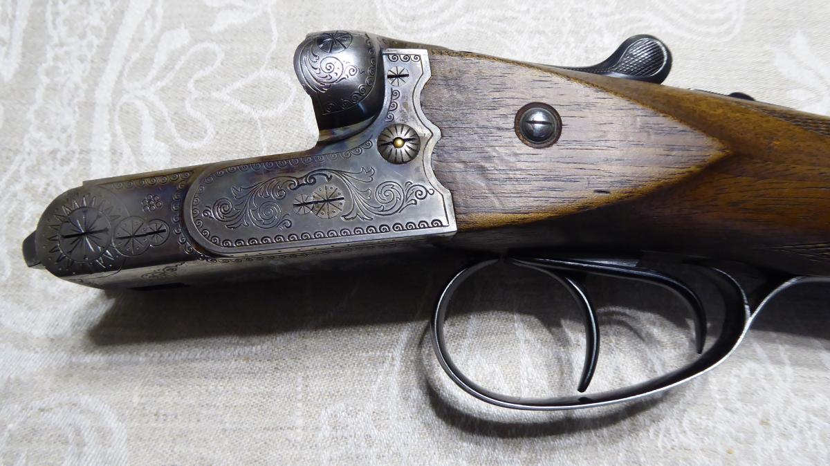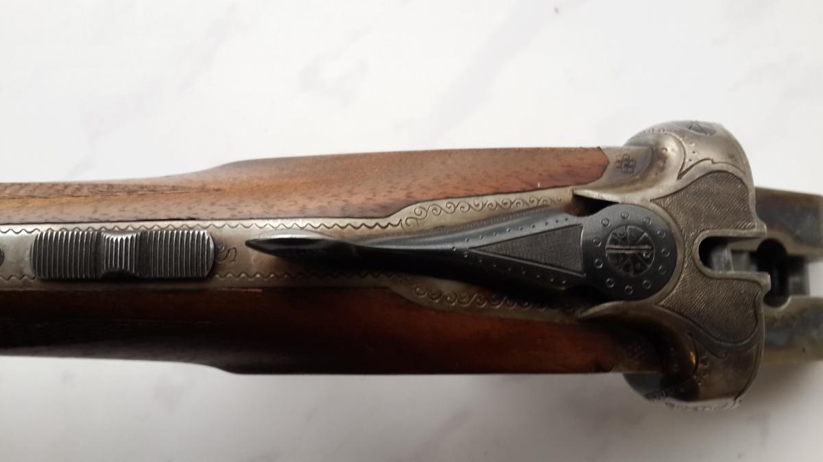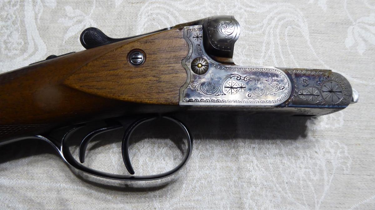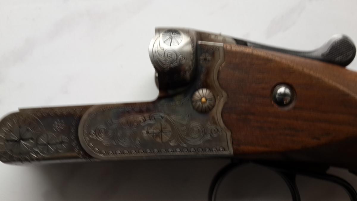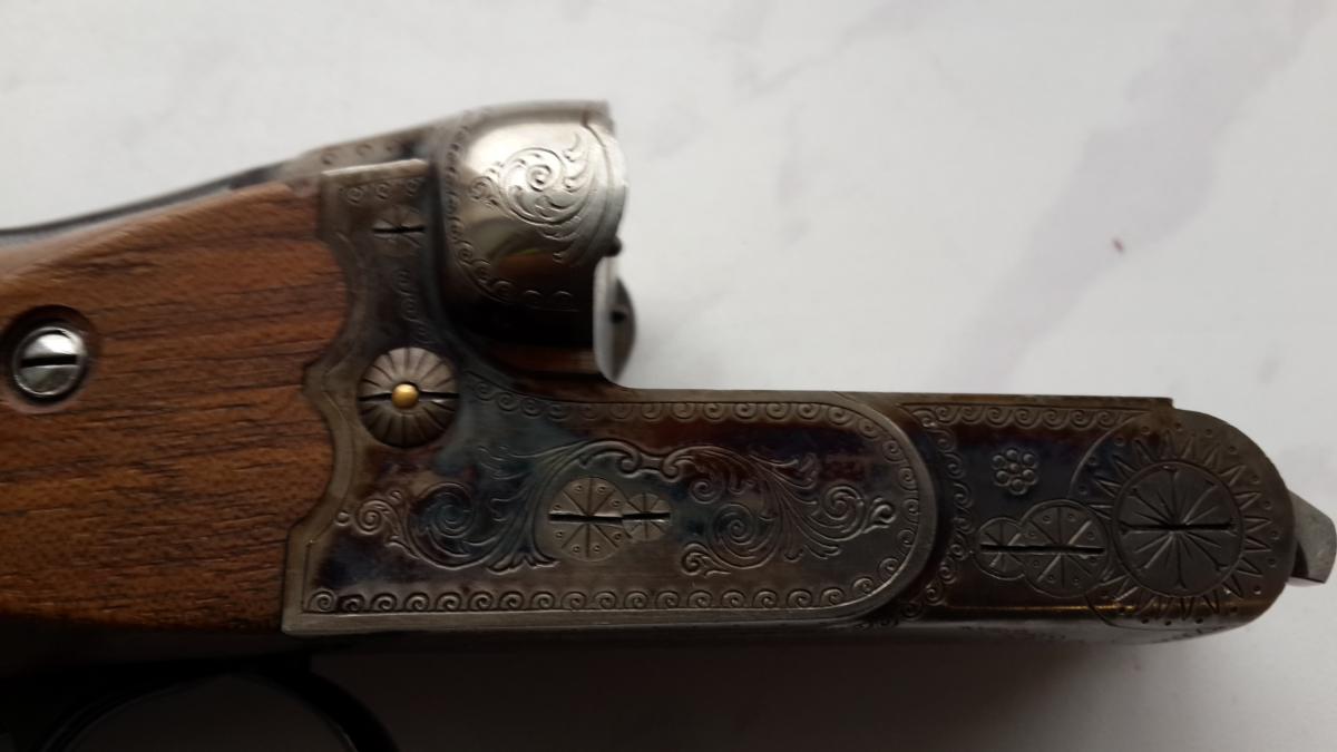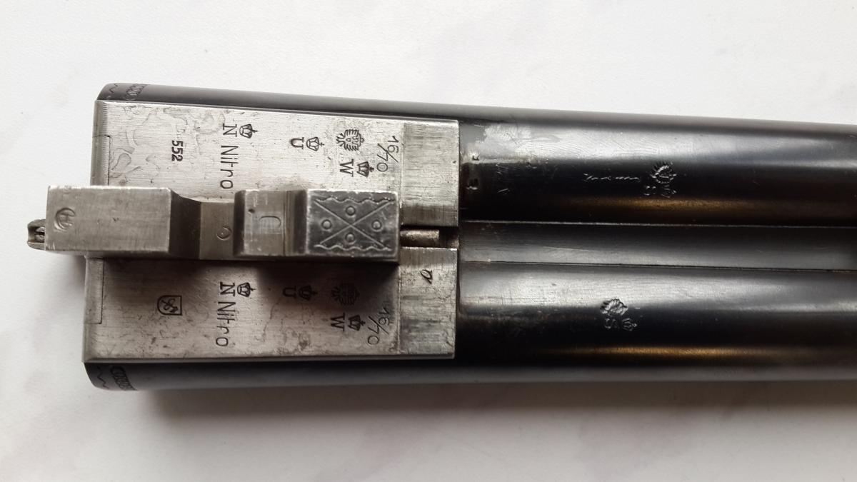 Скорее всего дерево меняно, оно слишком свежее для года и степени вытертости цветной калки на рабочих местах. Винты в цевье кручены, вообще все кручены, причём подручными средствами. Приклад плохо осадили, были щели - поставили стяжку, чтобы не переделывать. Стволы переворонены, коцки есть, но сверху всё черным-черно. Коцки на стволах, затёртая калка говорит о том, что ружьё работало, на дереве же их нет. Погиб гребня за шейкой не зимсоновский, как и сведение рельефа дерева шейки за стяжкой, насечка свежая, не затёртая, что никак не соответствует степени затёртости калки. Либо просто сняли дерево, шлифанули, обновили насечку и собрали. В общем "губы накрасили" и закинули в высший разбор! Весь пассаж- скромное мнение, без обид.