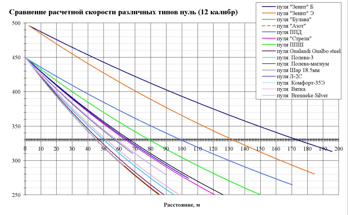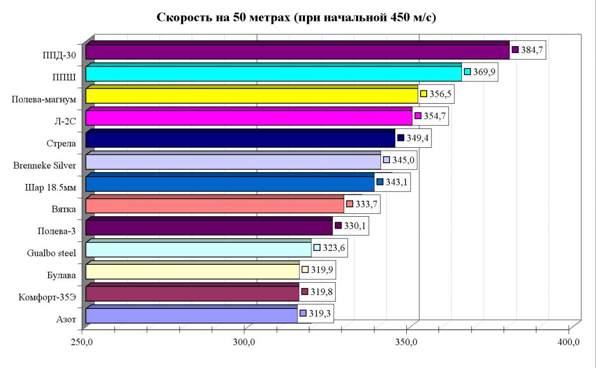 А дальше - уже просто видно что заметной-то разницы нет. Все тупорылые - Азот, Комфорт, Бреннеке, Гуаланди стальная - они все примерно одинаковы. Более тяжелые пули несколько лучше выглядят, именно благодаря бОльшей массе и значит бОльшему запасу энергии.