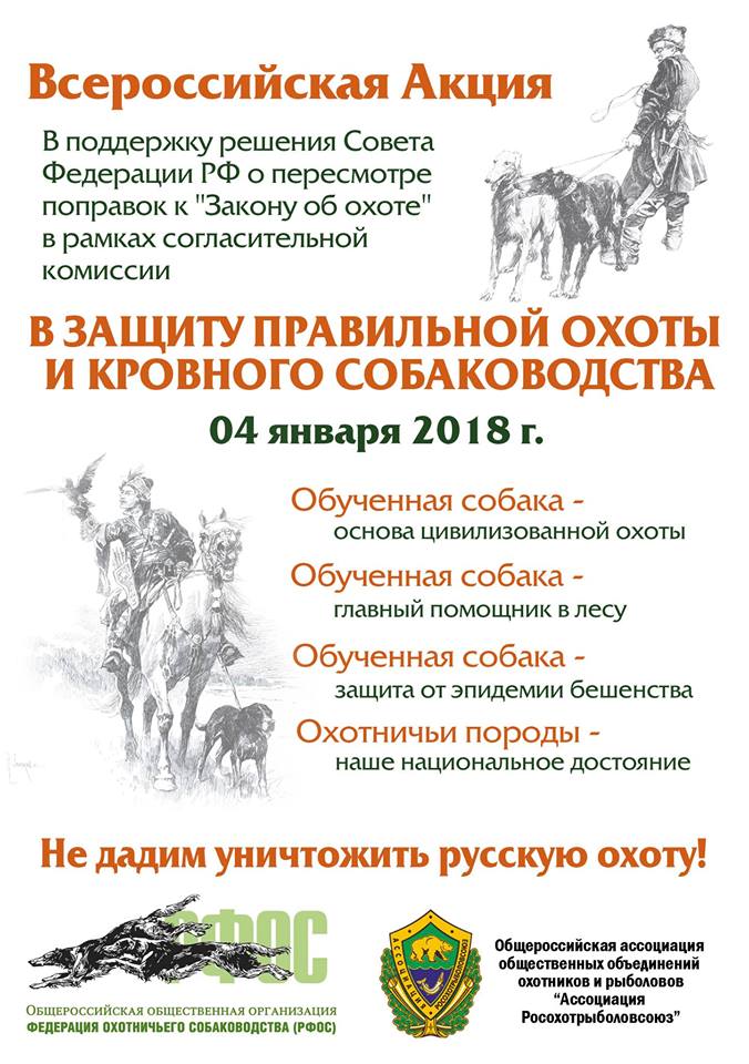 4 января 2018 года в Барнауле, Владивостоке, Воронеже, Ижевске, Казани, Курске, Москве, Оренбурге, Перми, Санкт-Петербурге, Ставрополе, Туле, Якутске прошли мероприятия Всероссийской акции «В защиту правильной охоты и кровного собаководства», инициированной Федерацией охотничьего собаководства (РФОС) и Ассоциацией «Росохотрыболовсоюз» (РОРС) в поддержку решения Совета Федерации РФ о пересмотре поправок в ФЗ «Об охоте и о сохранении охотничьих ресурсов и о внесении изменений в отдельные законодательные акты Российской Федерации» в рамках согласительной комиссии.