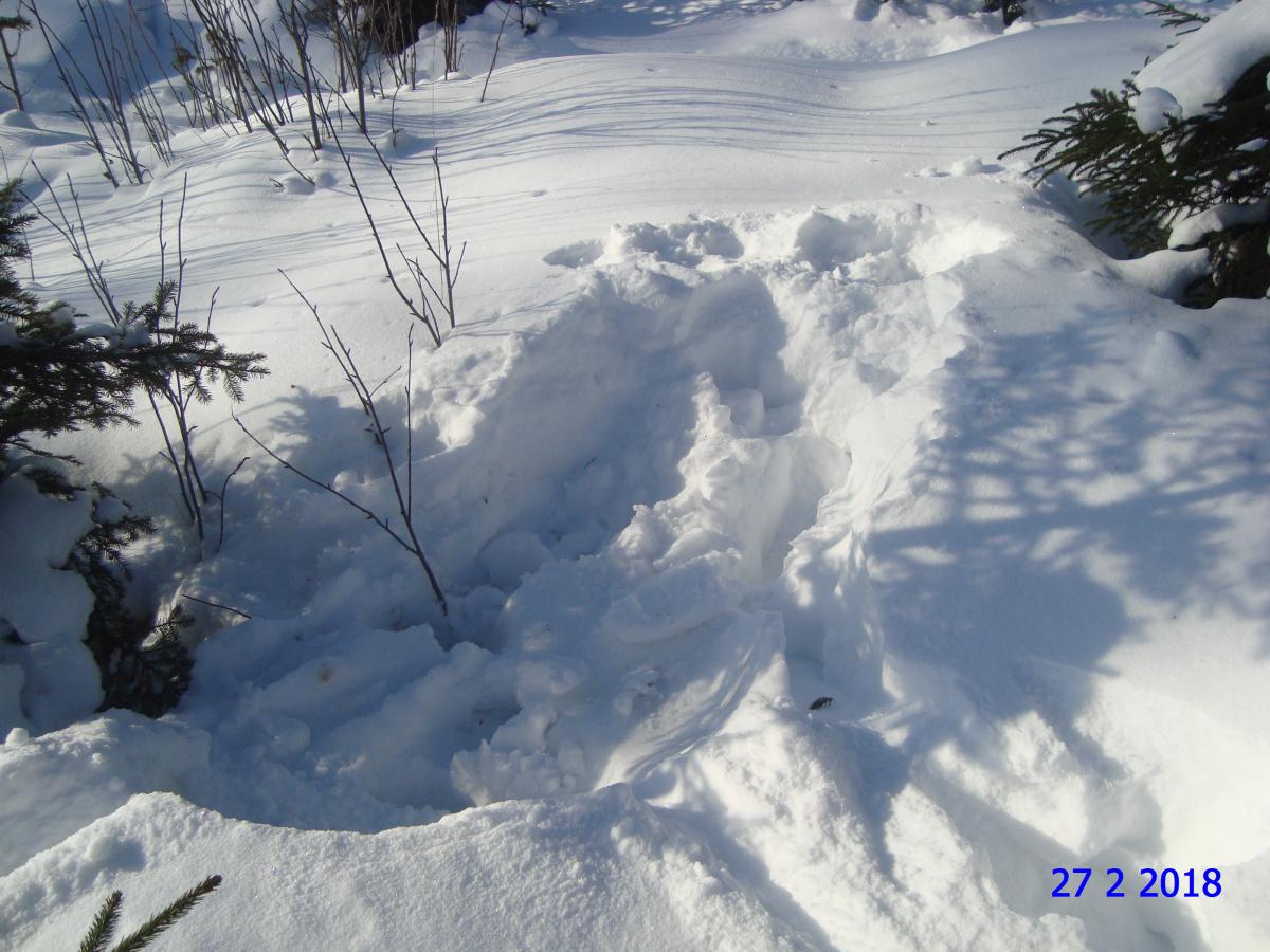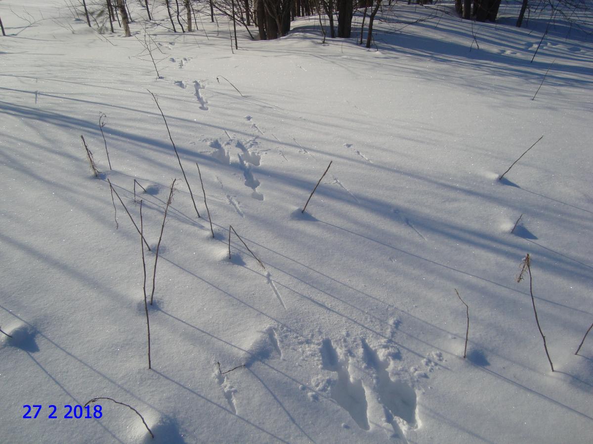Сегодня был в лесу. Закрыть добычей не получилось. Зайца толкнул с лёжки в кустарнике, услышал как он ушёл ломая сушняк. Рванул и я сквозь кустарник, но он оказался шустрее. Не увидел под выстрел. Так слегка что-то мелькнуло в кустах. Сегодня много топтаться не стал. Свежего снега не выпало и все следы одинакового вида.