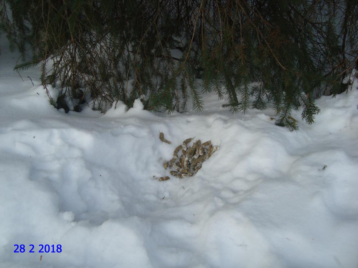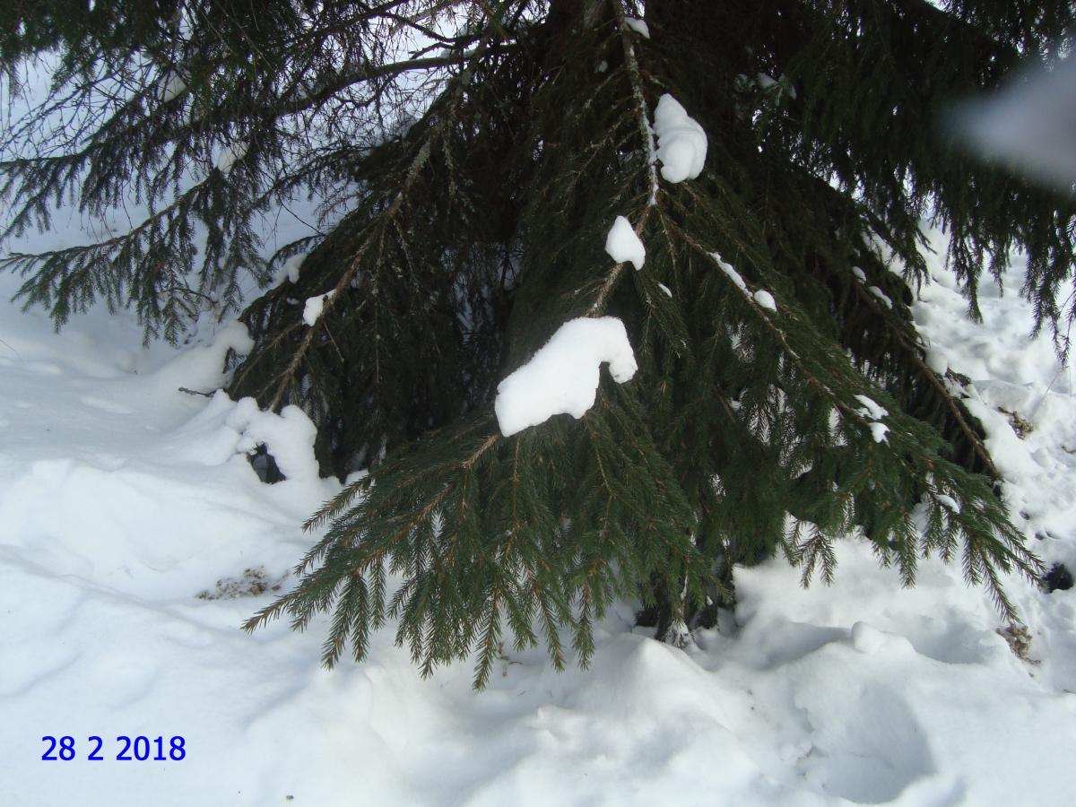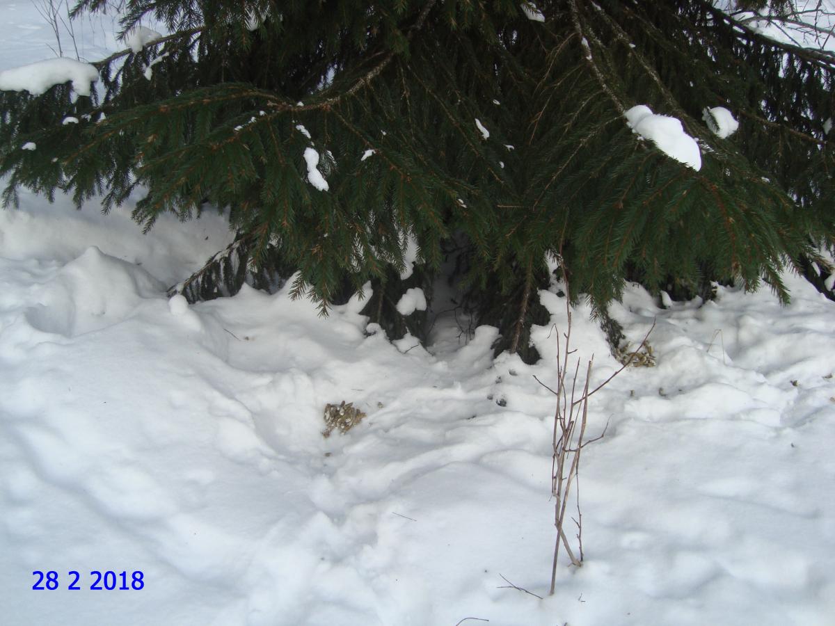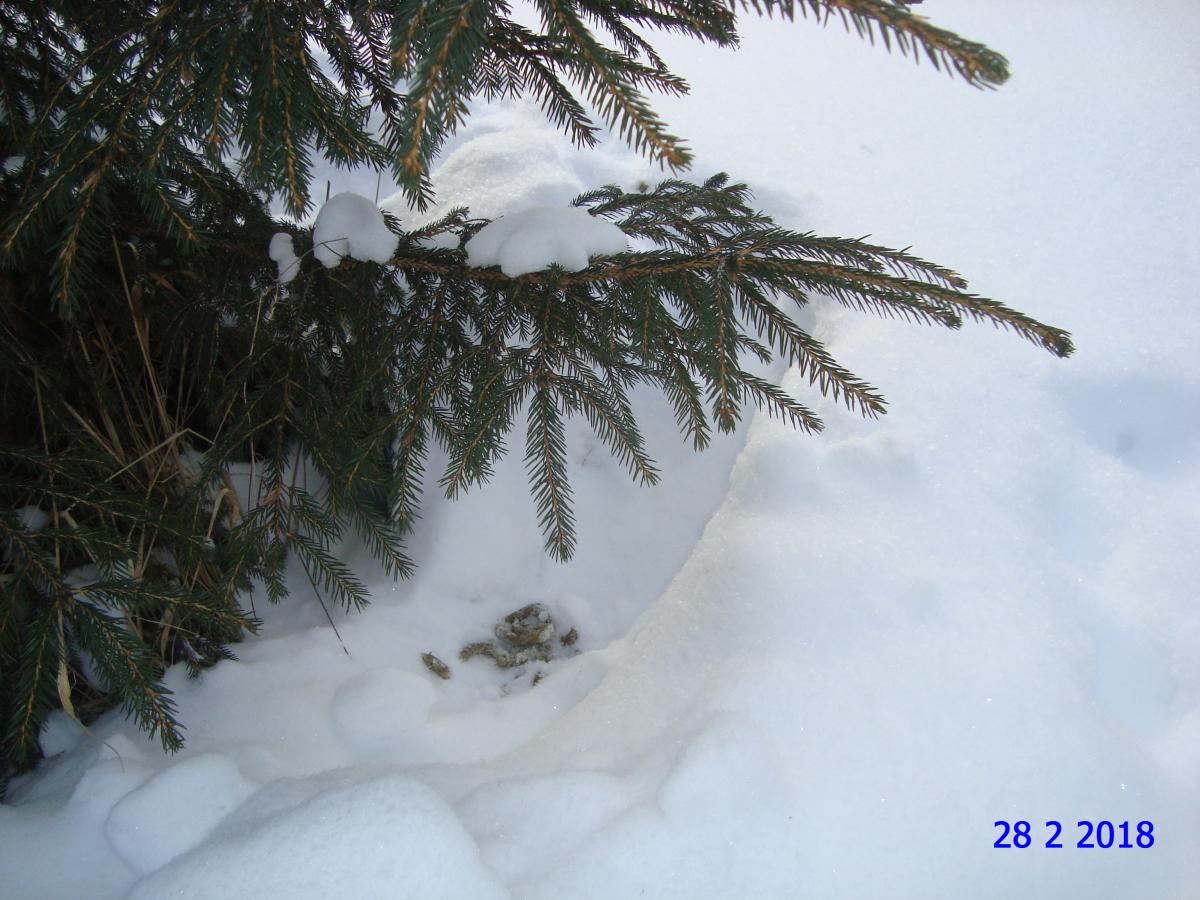 Мимоходом увидел глухаринные следы с местами ночёвок, днёвок. Набродов мало, а "лёжек" у елей по несколько мест.