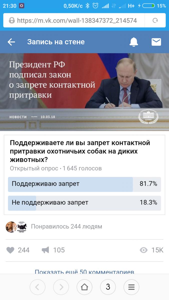 Пока мы тут на форумах сидим, совершенно далекие от охоты и охотничьего собаководства люди, всерьез голосуют теперь уже за запрет контактной притравки охотничьих собак в рамках очередной работы Госдумы над новым проектом закона "О собаководстве": https://m.vk.com/wall-138347372_214574
