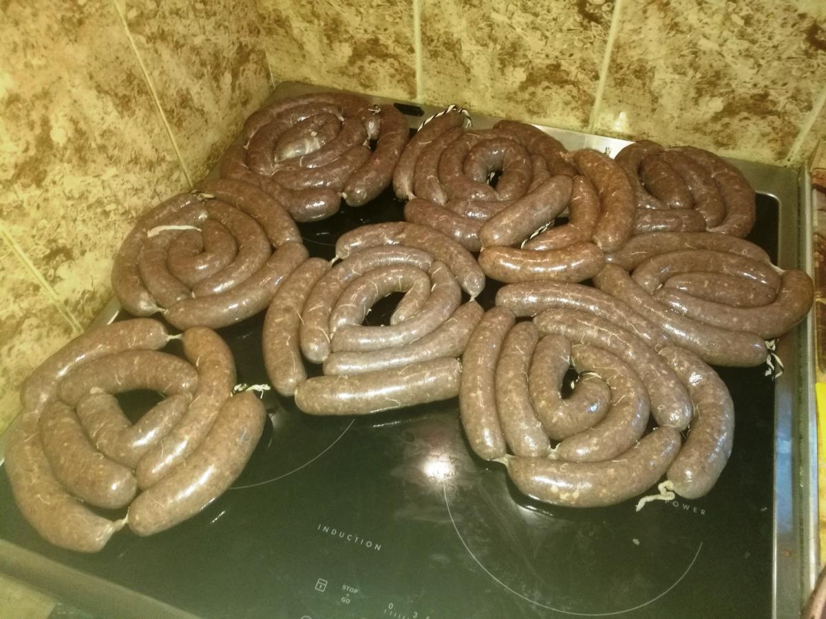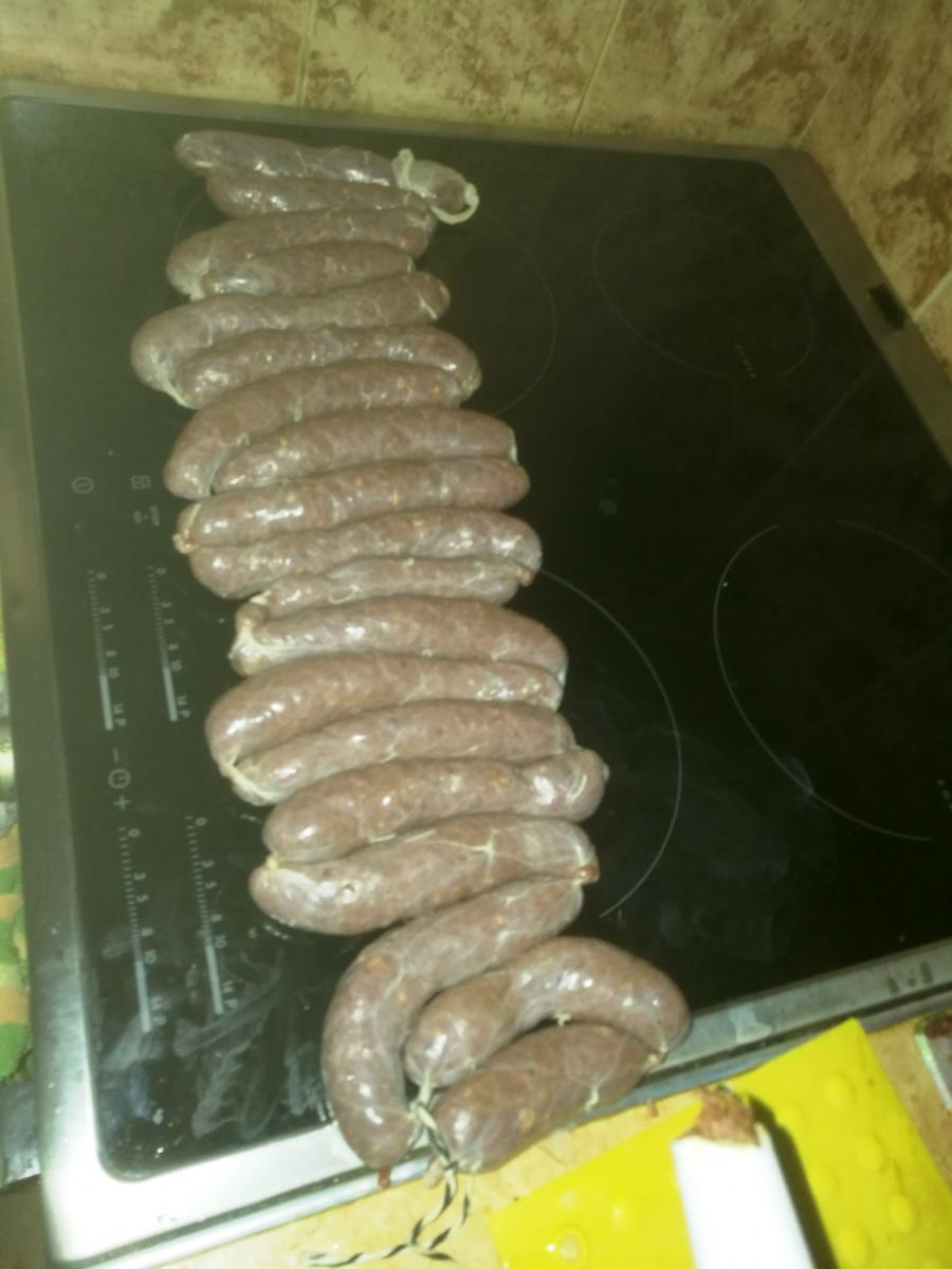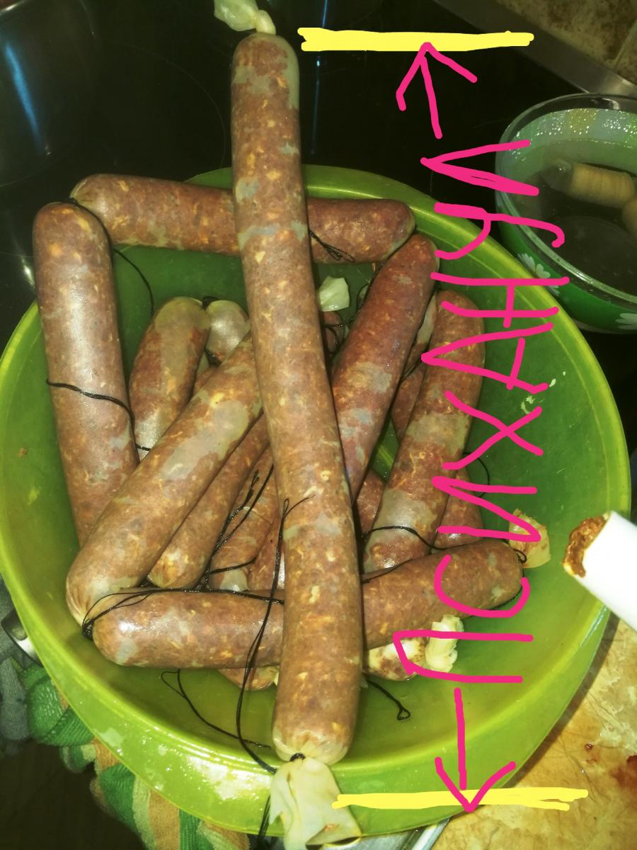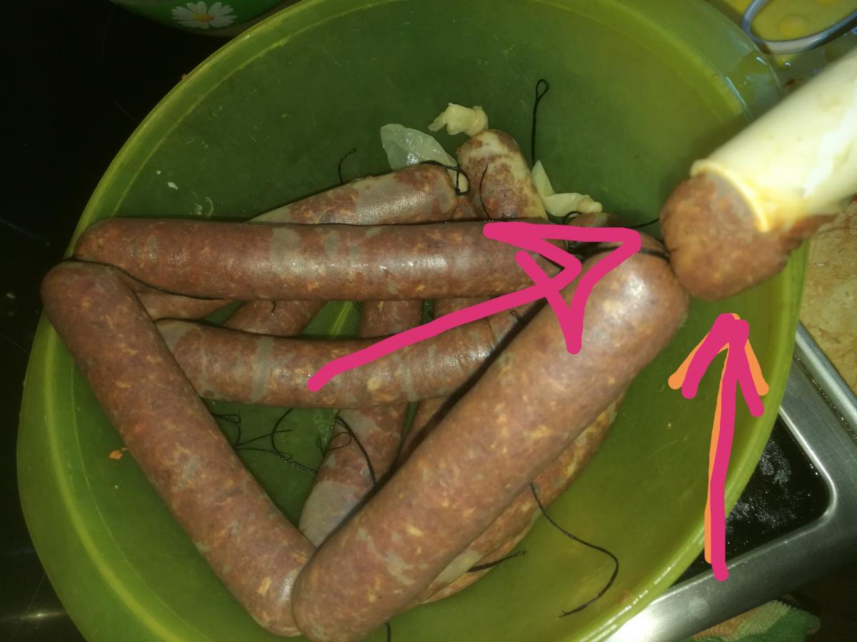Начало. Завяжем узел у начала кишки. И погоним мясо в кишку. Что получим?? ПРАВИЛЬНО! Получим воздушный пузырь.