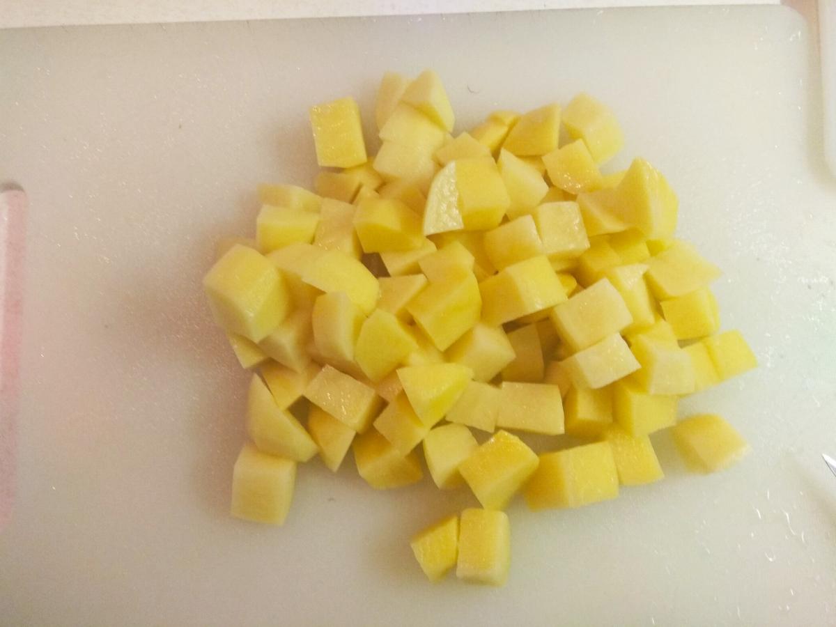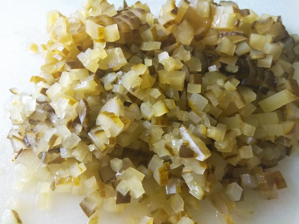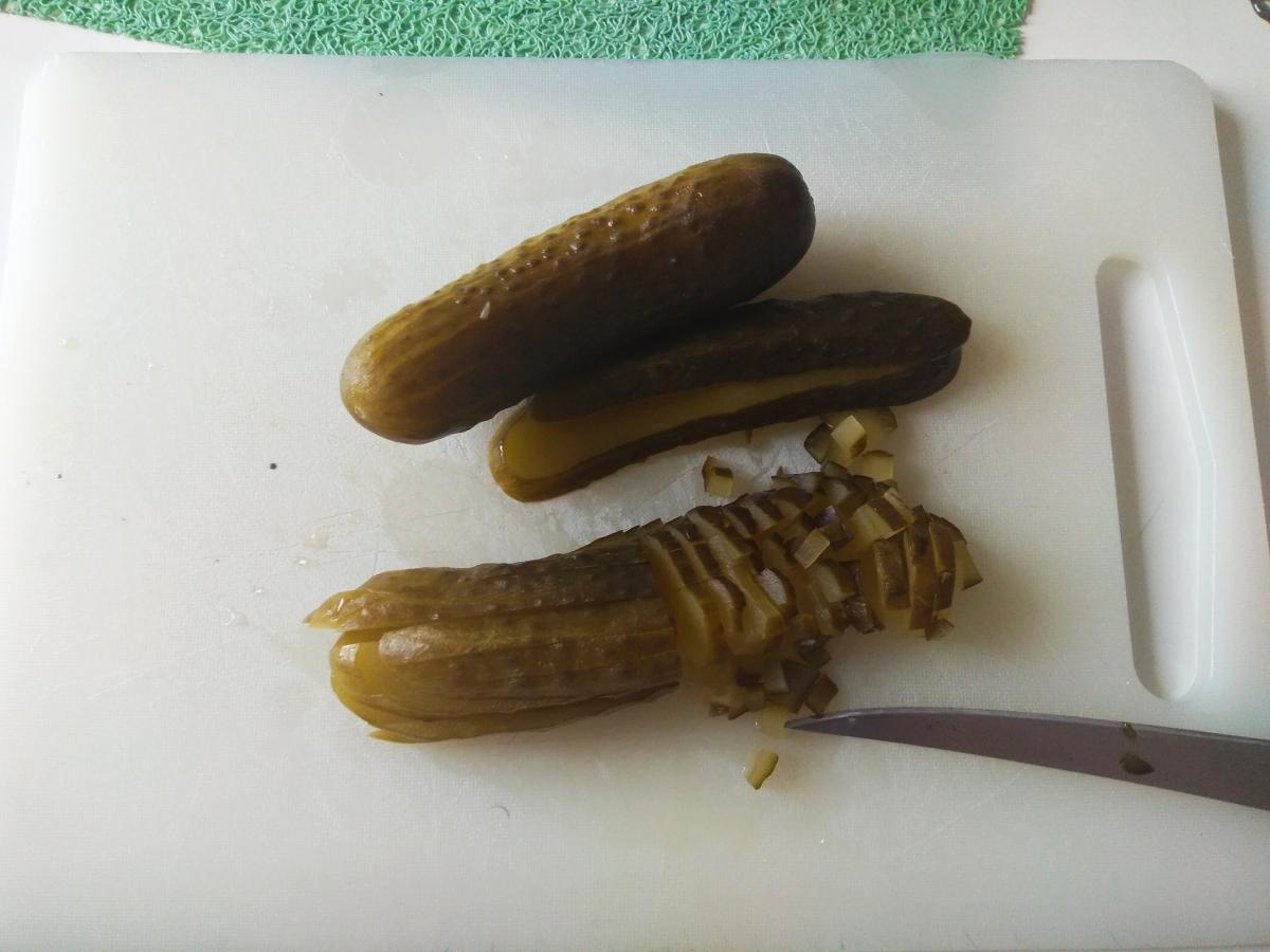 Картофель режем не крупными кубиками, лук и морковку пассеруем, мелко режем соленый огурец.