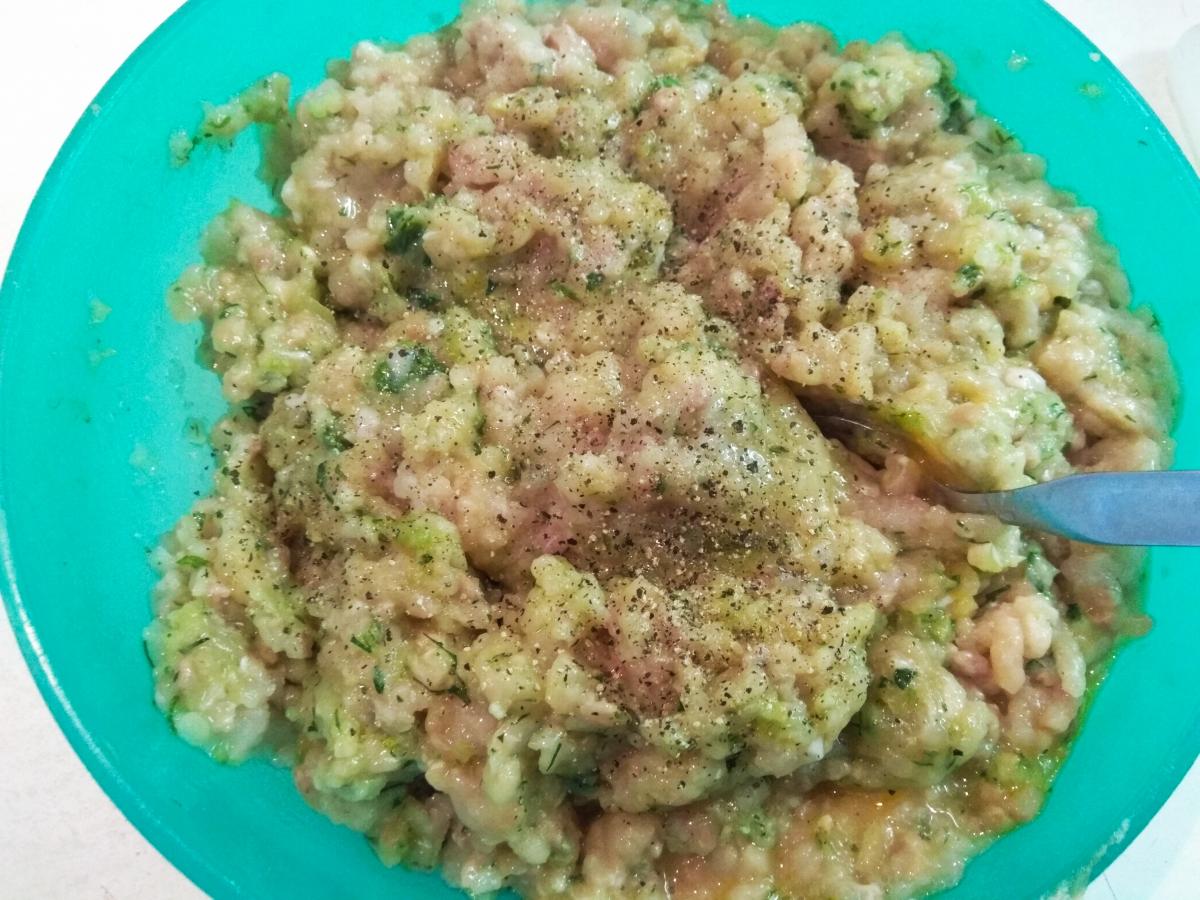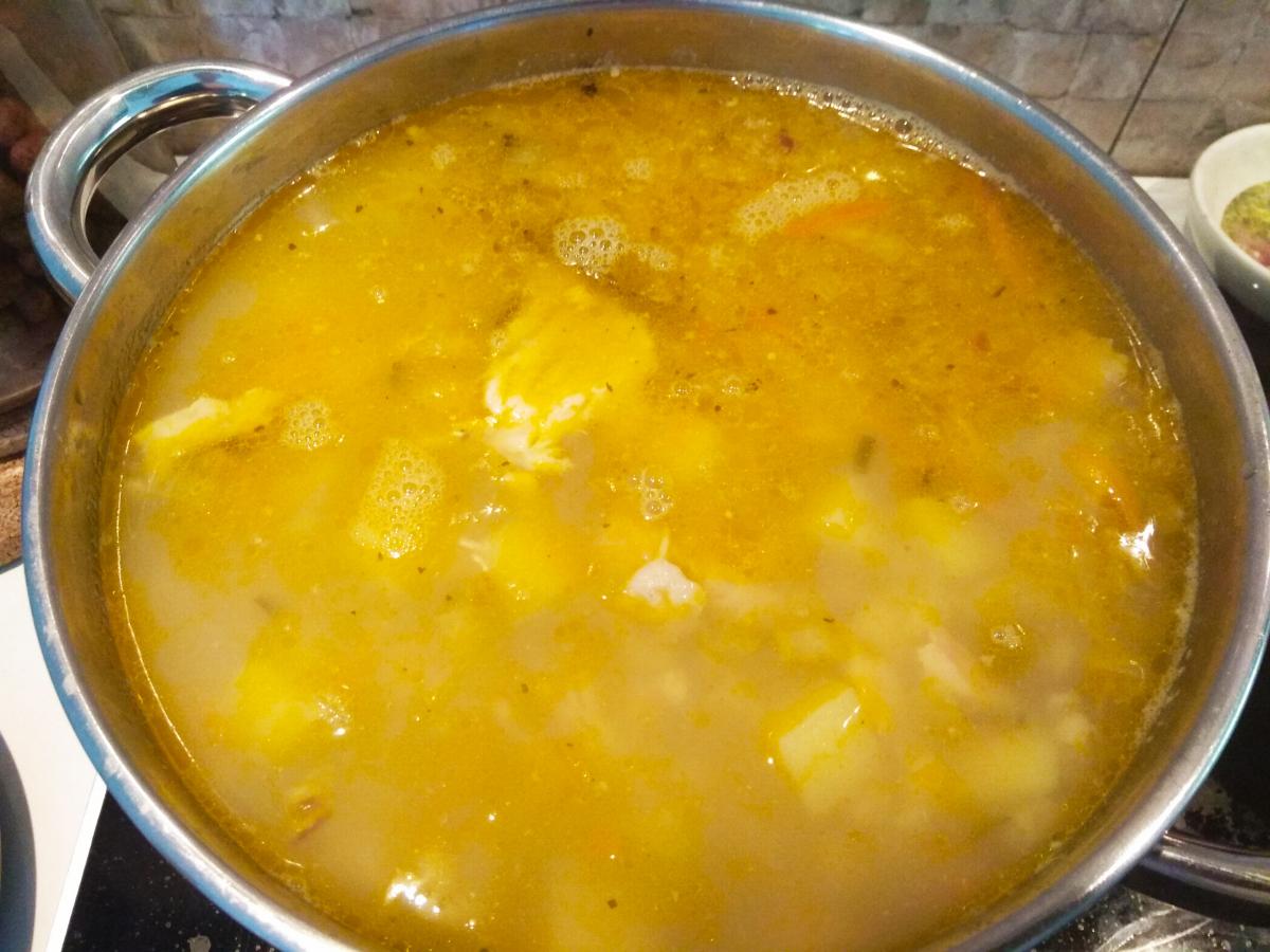 -Разбираем наши рыбные продукты и все ингредиенты закидываем в бульон, не забываем нашу уже разваренную перловку.