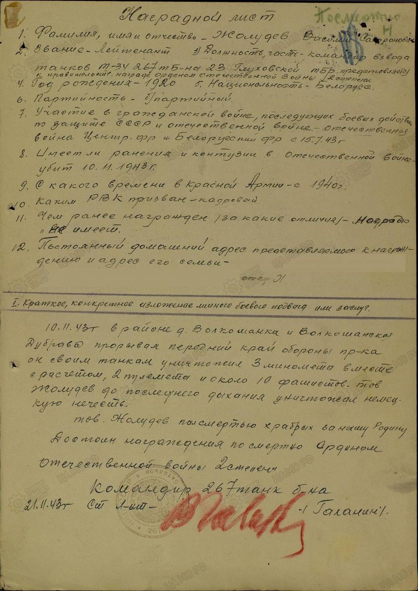 10.11.43г в районе д.Волкошанка и Волкошанская Дубрава прорывая передний край обороны пр-ка он своим танком уничтожил 3 миномета вместе с расчетом, 2 пулемета и около 10 фашистов. тов Жолудев до последнего дыхания уничтожал немецкую нечисть.