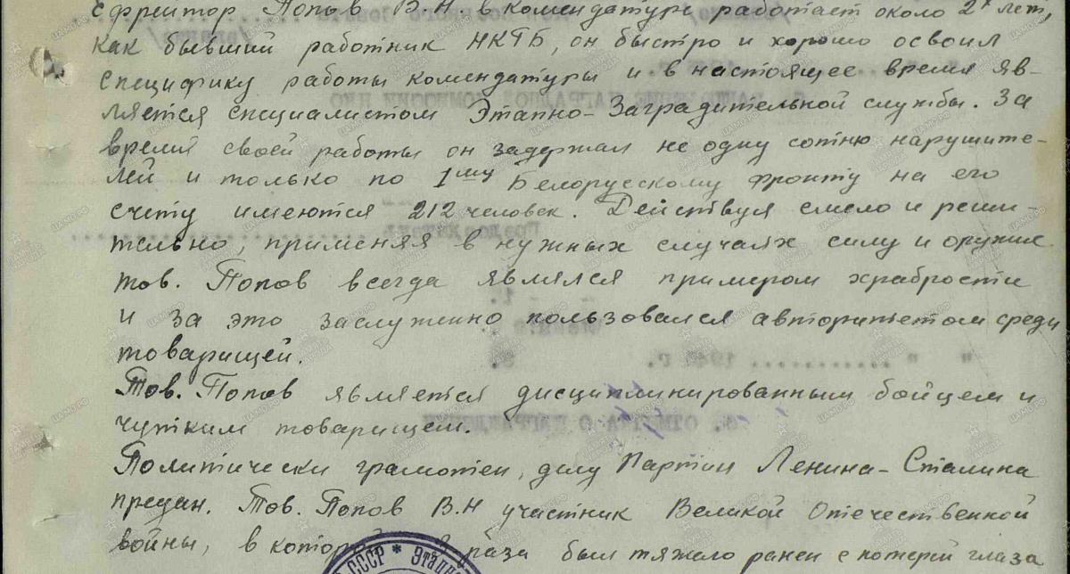 Попов Василий Николаевич, на срочную службу призван в 1940г, проходил её в 152 сп НКВД, охранял ГРЭС в Свирьстрое, с начала ВОВ перебросили в Ленинград, охранял Монетный двор, центральный телеграф, участвовал в эвакуации ценностей. В июле 41, по моб.плану переброшен под Псков в 37 пограничный полк НКВД, отступали с боями под Старую Руссу...16 или 20(не помню) августа ранение в руку осколком мины, своим ходом(пешком) в госпиталь в Калинин. В октябре 41 Москва ОМСБОН, после введения осадного положения в Москве, патрулирование улиц, охрана объектов, бои на можайском направлении, осколочное ранение в голову под Рузой...Госпиталя...вторая половина 42г курсы снайперов. Потом направлен в Воронеж( кажется 41 погран полк), и на переформирование в Свердловск в 10 сд войск НКВД, которая была переименована в 181 сд , в феврале 43 выгрузка на ст.Фатеж и форсированным маршем 250км под Севск, на выручку попавшему в окружение кав.корпусу, бои у д.Юпитер и ранение глаза осколком шрапнели.( В ОБД Мемориал числится погибшим 24.03.43г под деревней Фарыгино) НО дед выжил! Госпиталя....(стеклянный левый глаз...но не комиссовали..)Потом 22 этапно-заградительная комендатура на ст.Мичуринск,( после службы бегал домой за 10км, когда отпускали), а в январе 45 комендатуру перебросили под Варшаву, ст.Кутно, там и закончил войну...Из наград были 5 медалей( За Отвагу, за оборону Ленинграда, за оборону Москвы, за победу над Германией, а еще какая не помню) и орден Красной Звезды. Когда платить за них перестали дед отдал их отцу моему в биточки играть...В ОБД Мемориал есть запись только о Красной Звезде...(Полки не особо похоже вели документацию...а может архивы ПВ пока не рассекречены...)